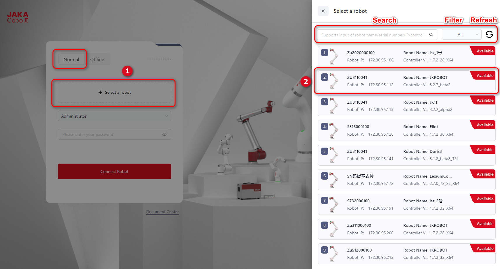 - A list of robots will be displayed on the right side. Users can select the intended robot from the list directly or search/filter within the box.