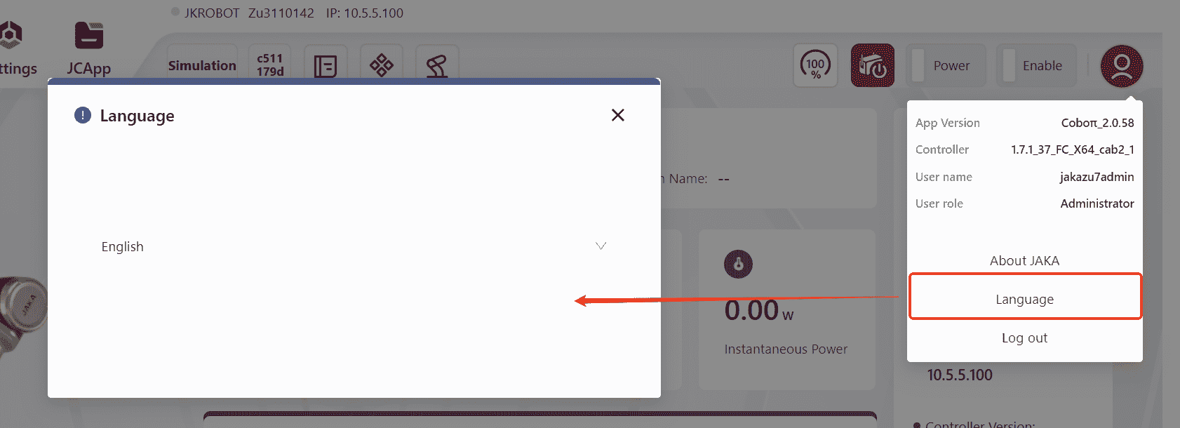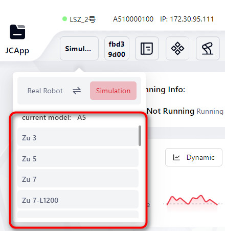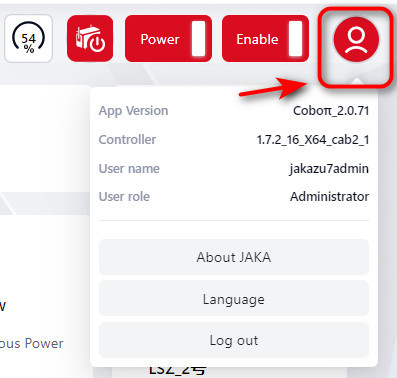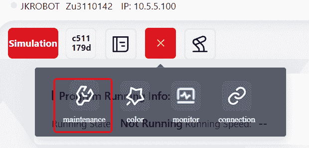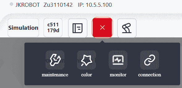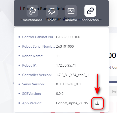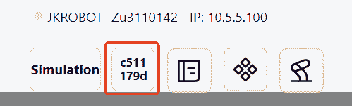 Click this icon to view detailed robot information, including: Robot Name, Robot Serial Number, Robot IP, Controller Version, Servo Version, SCB Version ant etc.
