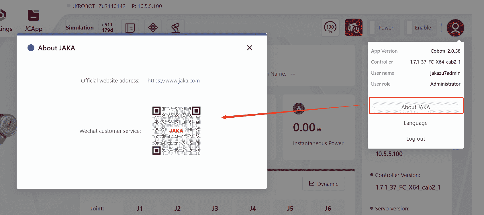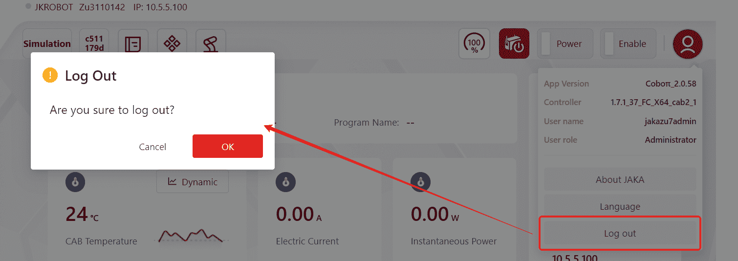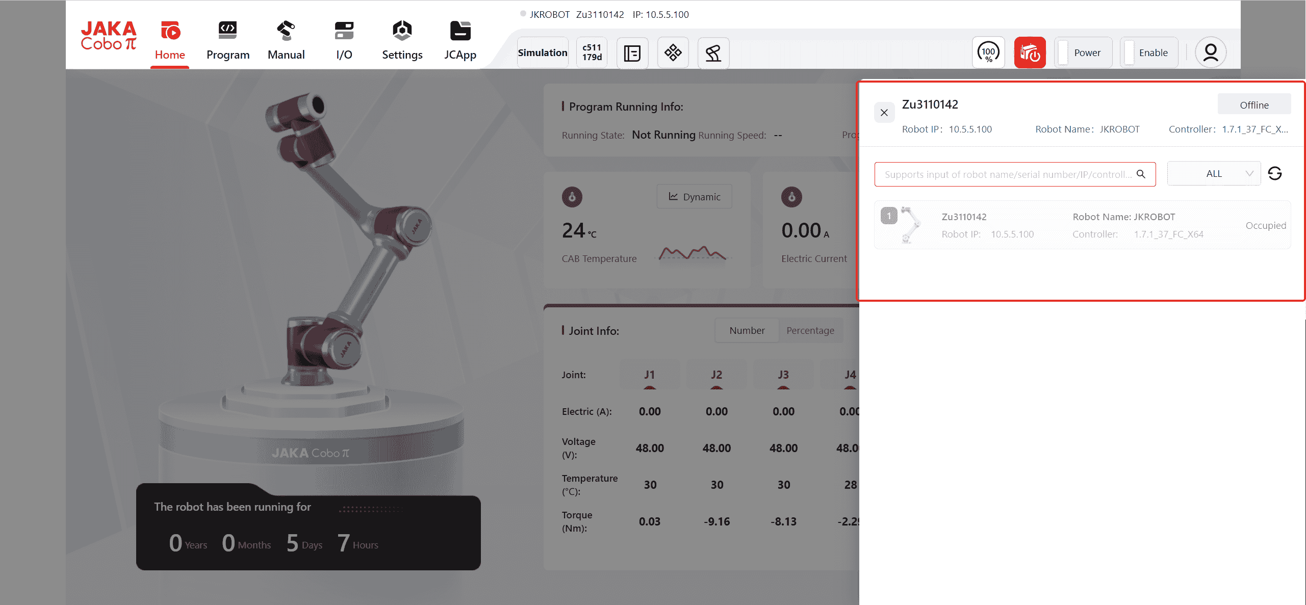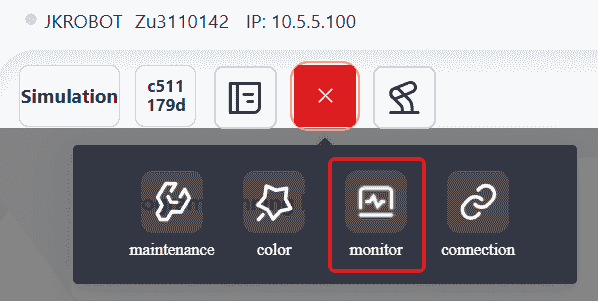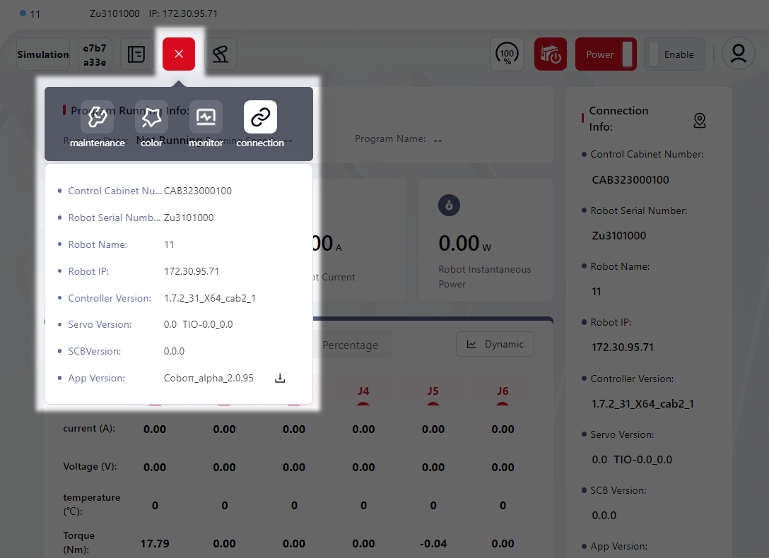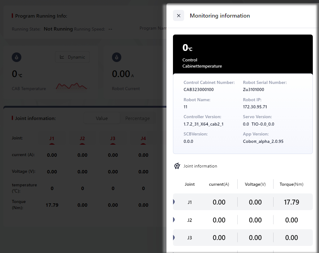 and view real-time information about the robot, including: Control Cabinet Temperature, Robot Current, Robot Instantaneous Power, Robot Name, Control Cabinet Number, Robot Serial Number, Robot IP, Controller Version, Servo Version, SCB Version, as well as the Current, Voltage and Torque information of each of the robot's joints.