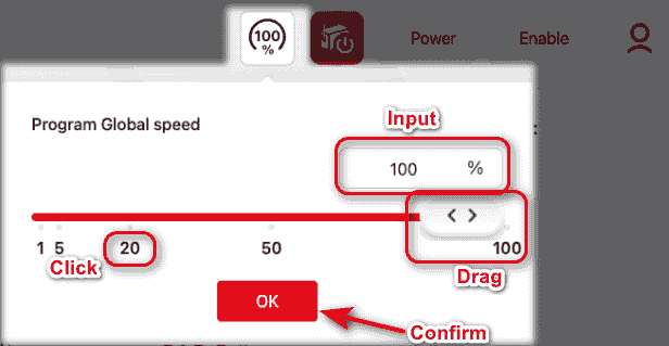 Click this icon to control the robot's operating speed within the program. A value (ranging from 1-100) can be entered, or the slider can be adjusted to change the speed.