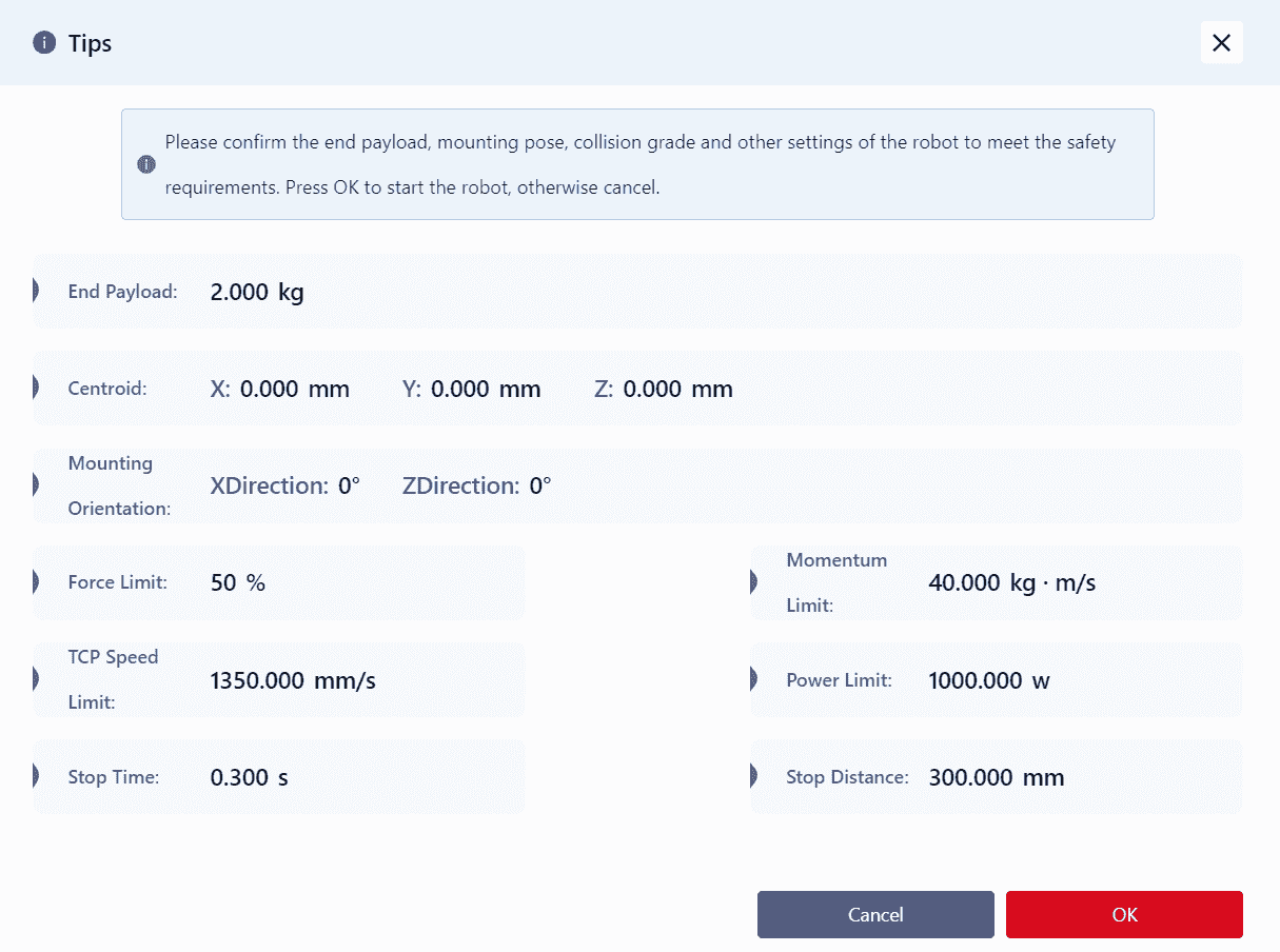 After clicking the power-on button, a pop-up will appear. Confirm the robot's relevant information in the pop-up (including:End Payload, Center of Mass, Mounting Orientation, Force Limit, TCP Speed Limit, Momentum Limit, Power Limit) and then click OK
