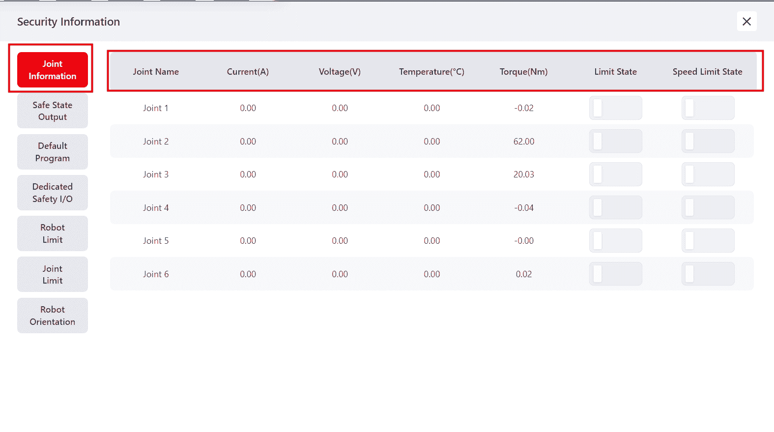 This page shows information related to the robot's joints: