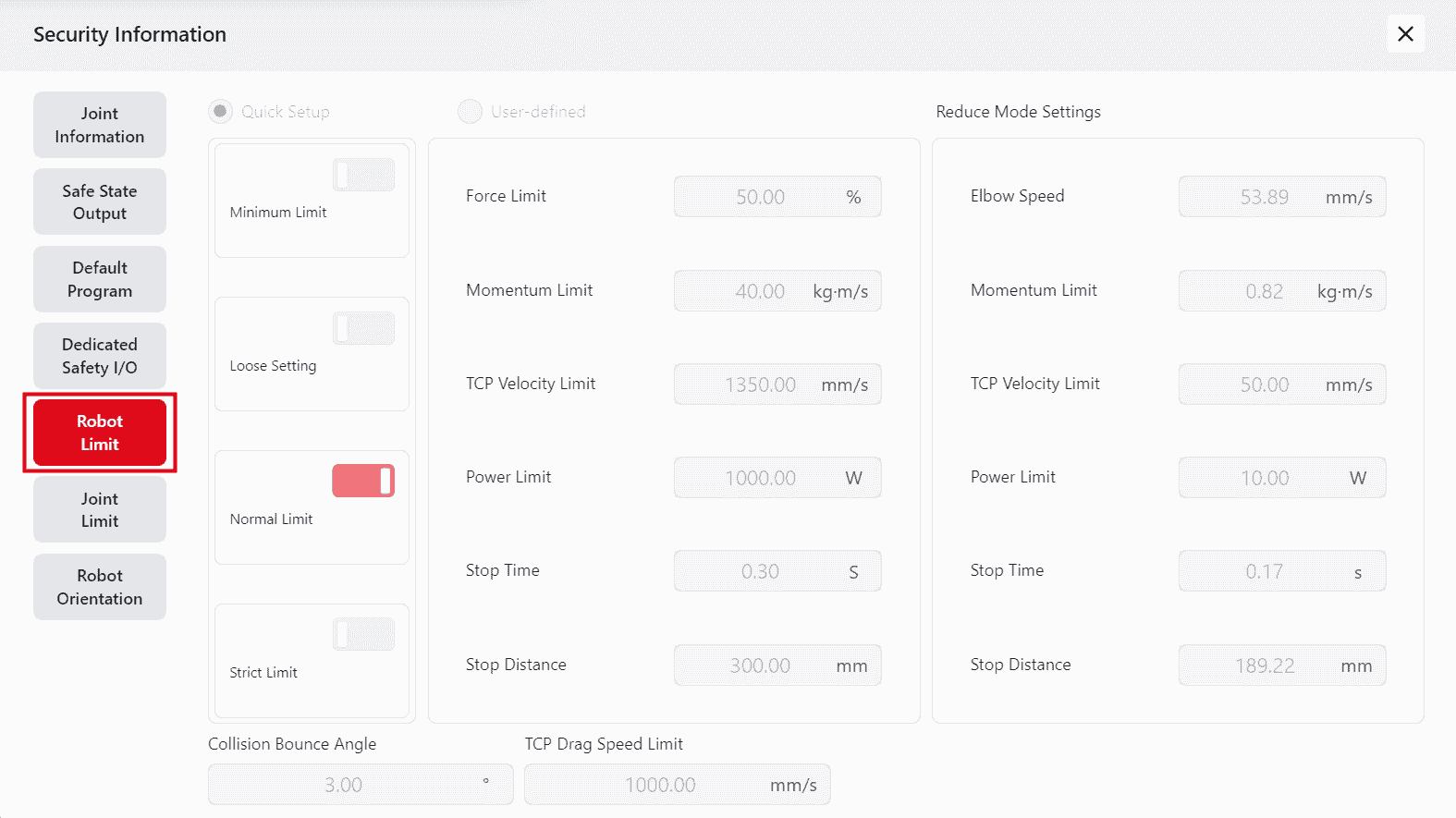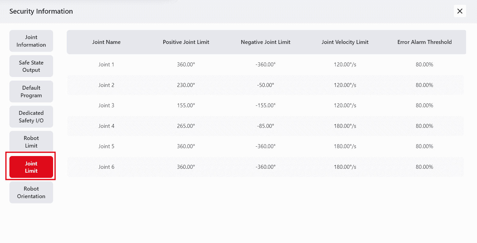 This page shows the joint limit information for the robot: