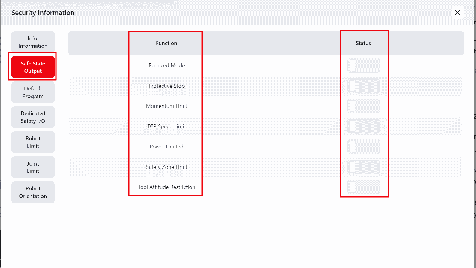 This page displays the safety-related statuses the robot is currently in: