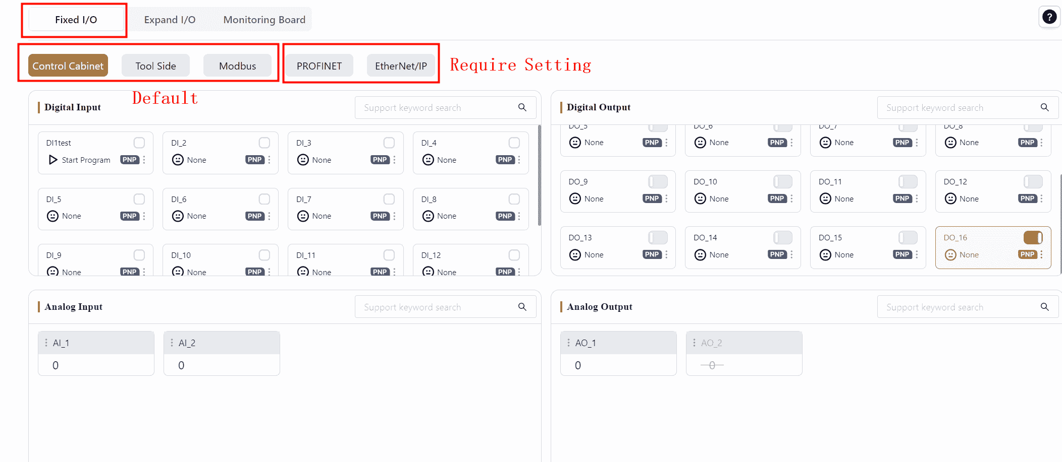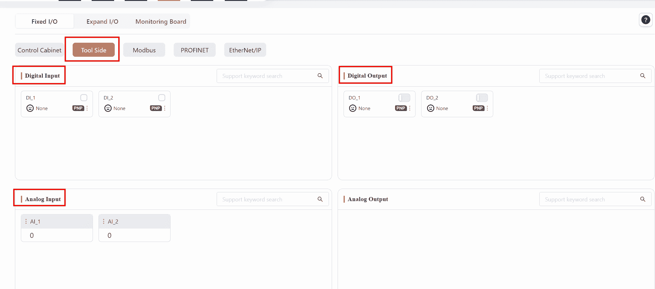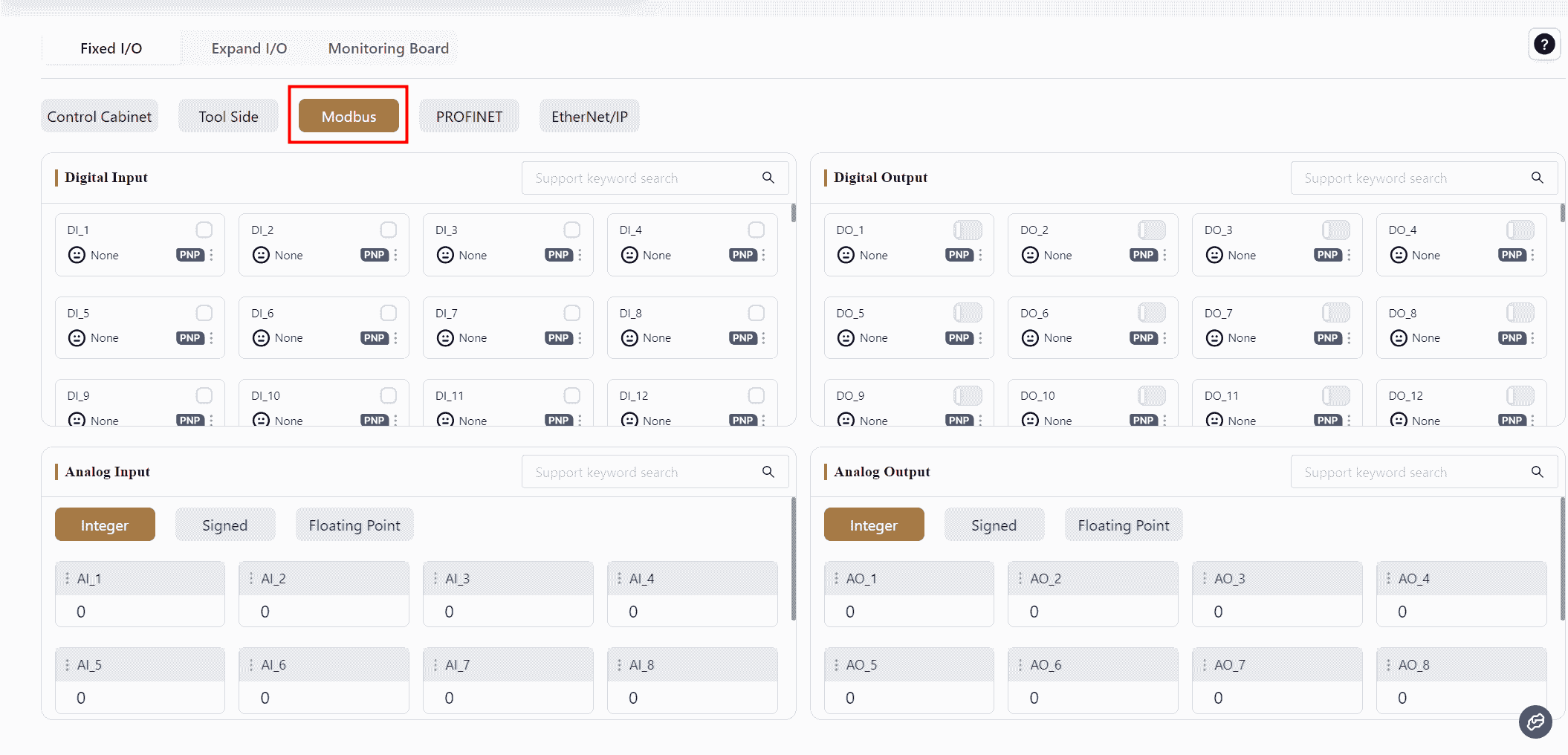 There are five types of Fixed I/O. Control Cabinet I/O, Tool-end I/O, and Modbus I/O are the default I/O types.