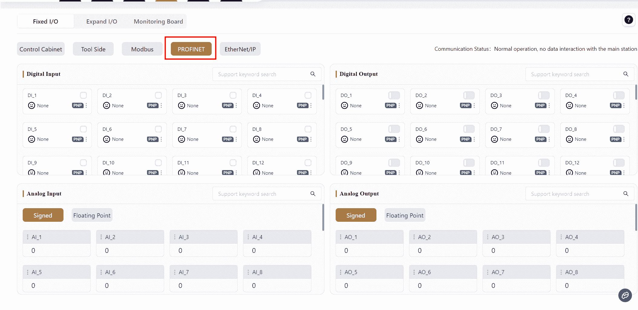 In the PROFINET window, the I/O signals represent the I/O data accessible via PROFINET communication between the robot and external devices. As a PROFINET device, the controller supports 64 digital inputs and 64 digital outputs, 32 signed analog inputs, and 32 signed analog outputs, as well as 32 floating-point analog inputs and 32 floating-point analog outputs.