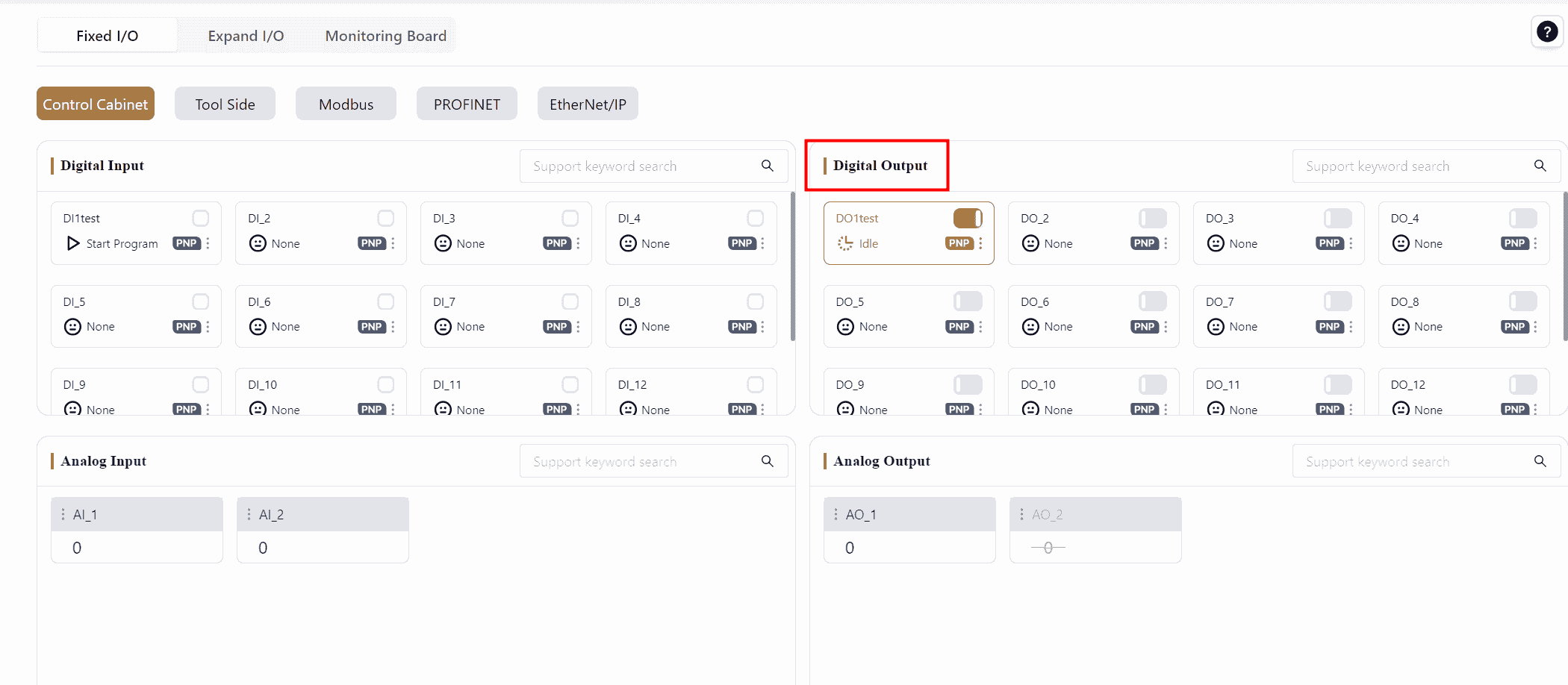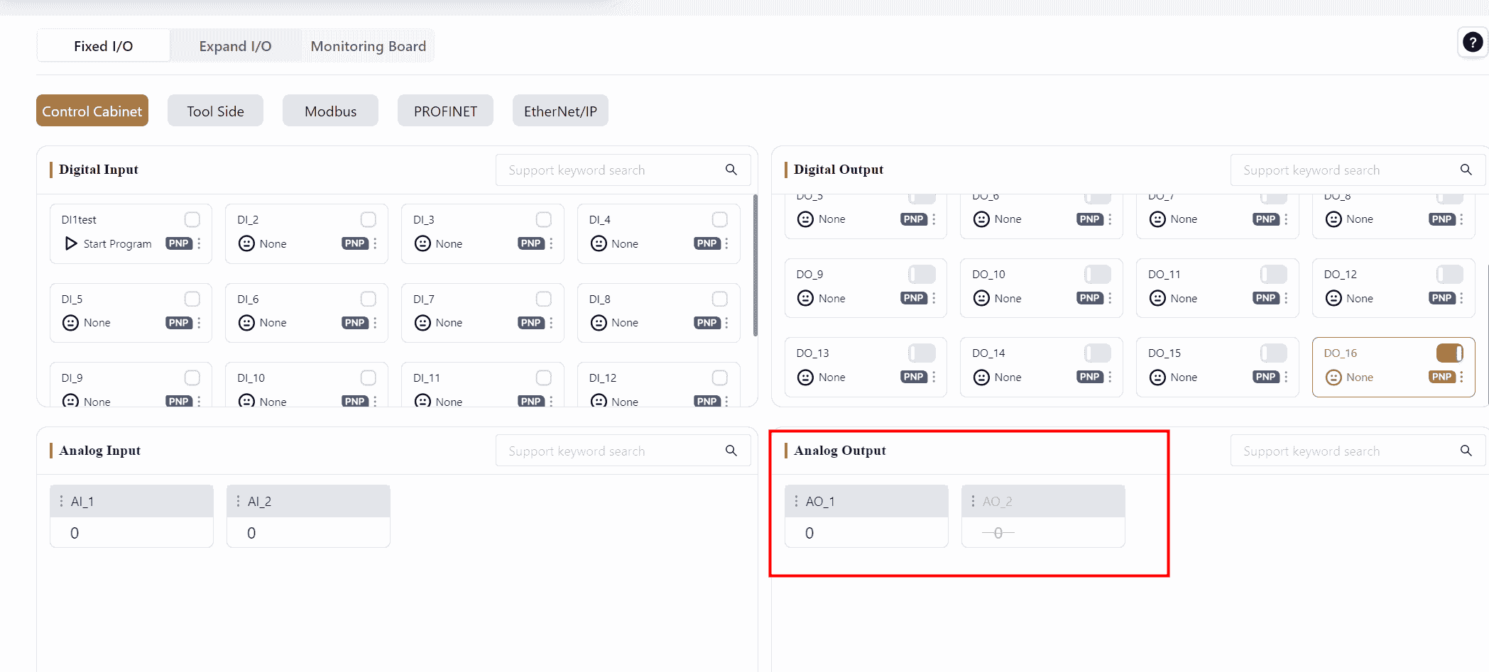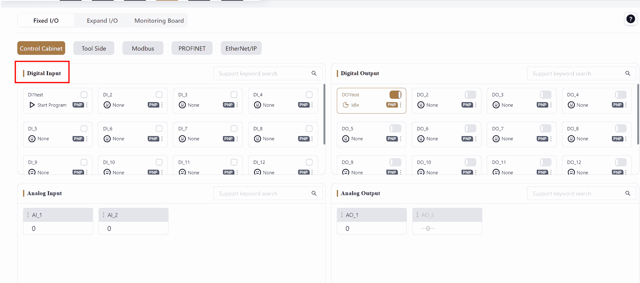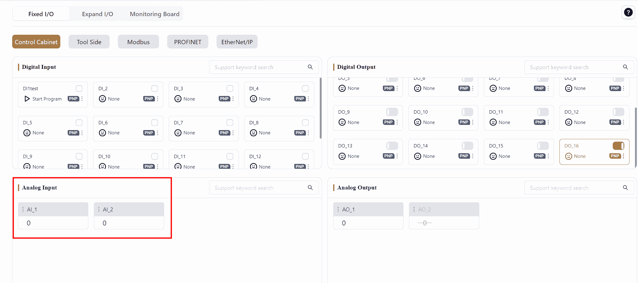 CAB 2.1: It features 16 physical inputs, 16 physical outputs, and 2 analog signals, all of which are PNP type, triggered by 24V input. When connecting CAB 2.1 with Coboπ, the I/O panel displays the physical signals from the control cabinet, and the scroll bar on the right can be used to view other I/O statuses.