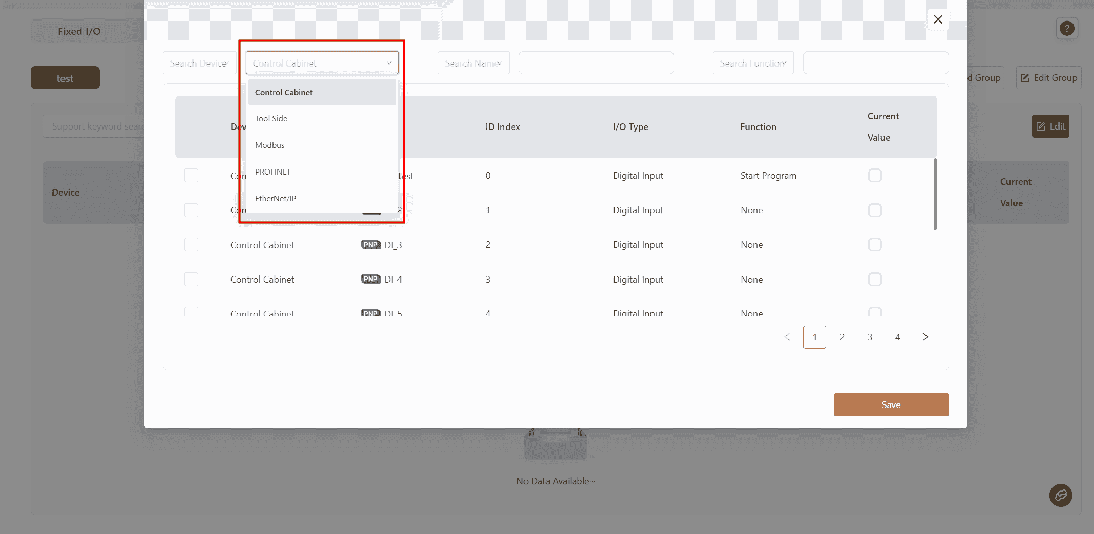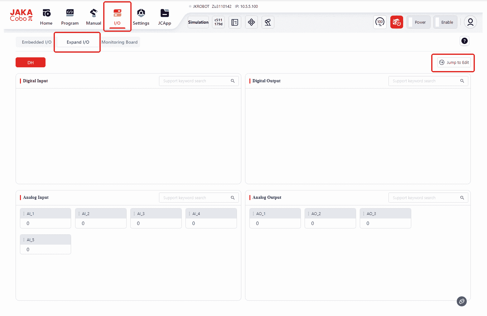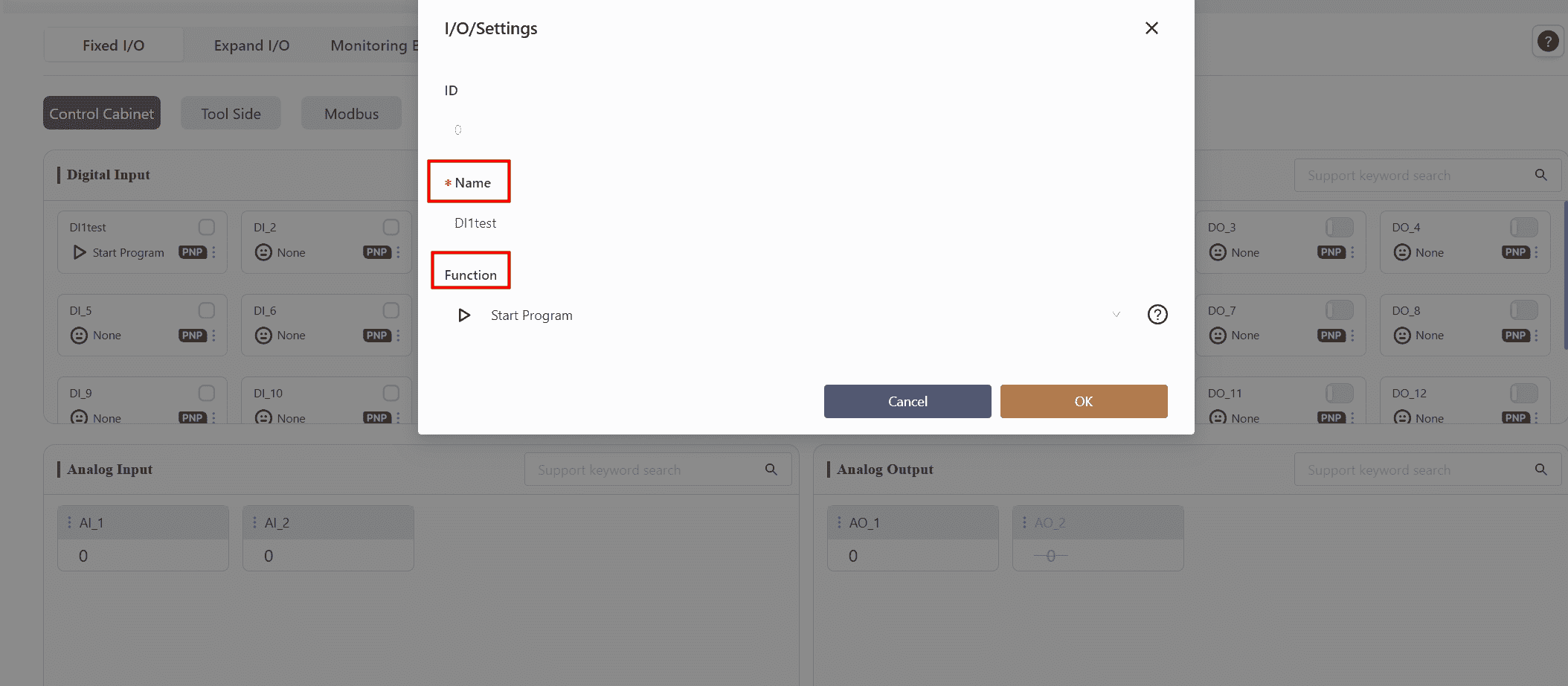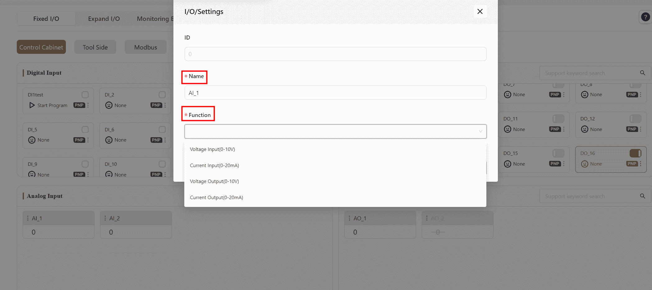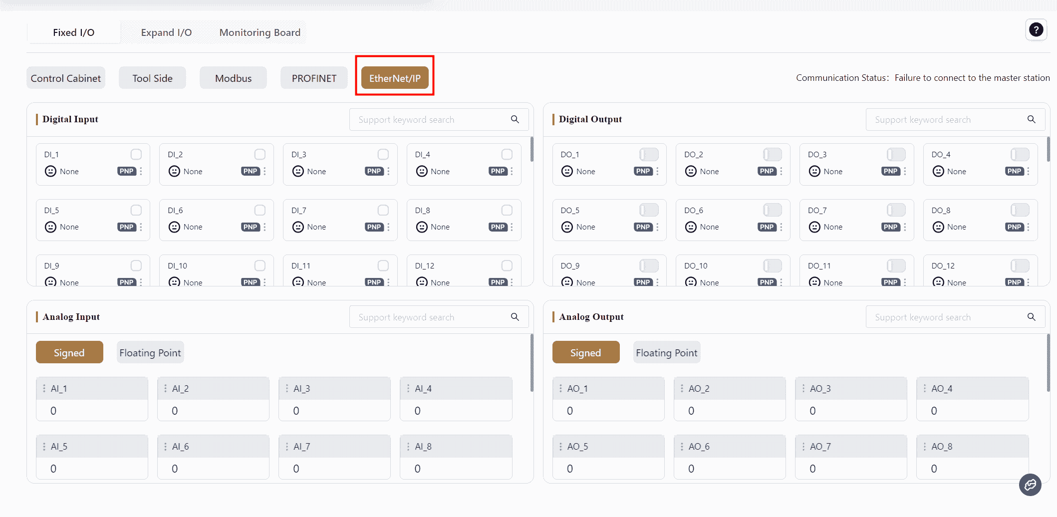 CAB 2.1: It features 16 physical inputs, 16 physical outputs, and 2 analog signals, all of which are PNP type, triggered by 24V input. When connecting CAB 2.1 with Coboπ, the I/O panel displays the physical signals from the control cabinet, and the scroll bar on the right can be used to view other I/O statuses.