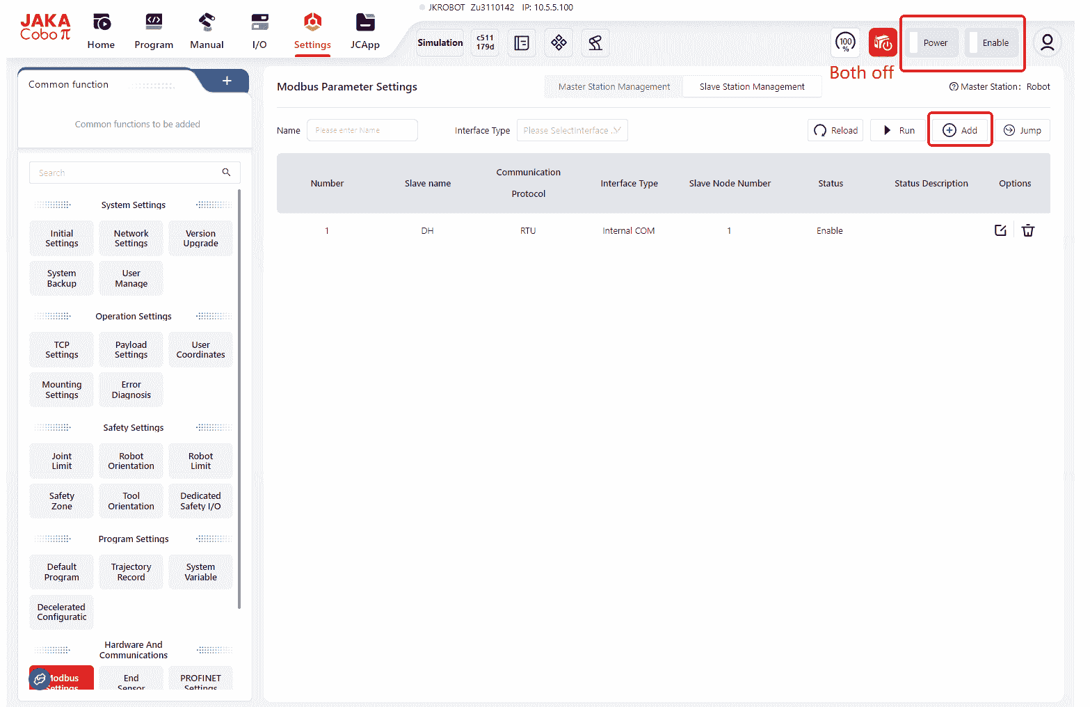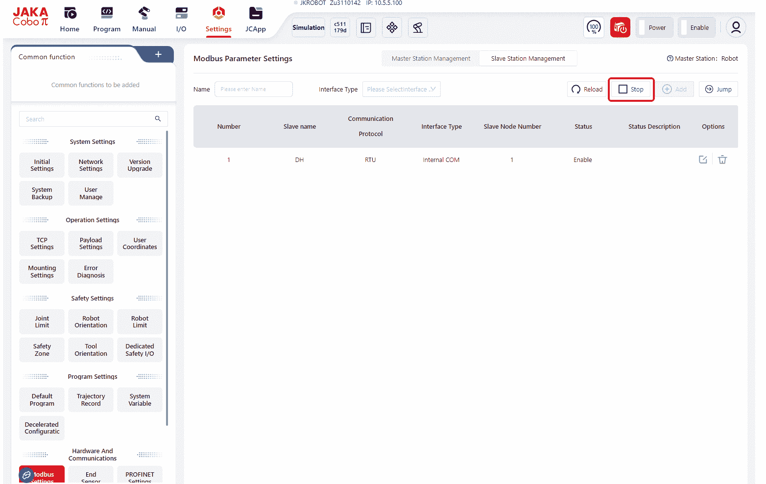 The JAKA robot control cabinet supports the Modbus communication protocol and can function as a Modbus slave to communicate with external devices.