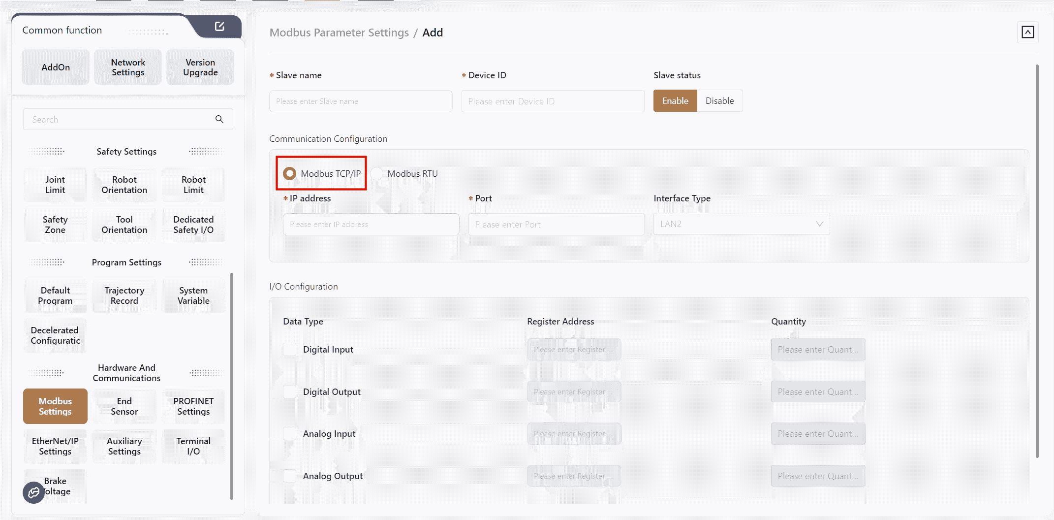 For detailed definitions of Modbus register addresses, refer to the:Modbus I/O Address Table For PLC communication configuration, please refer the JAKA Communication User Manual