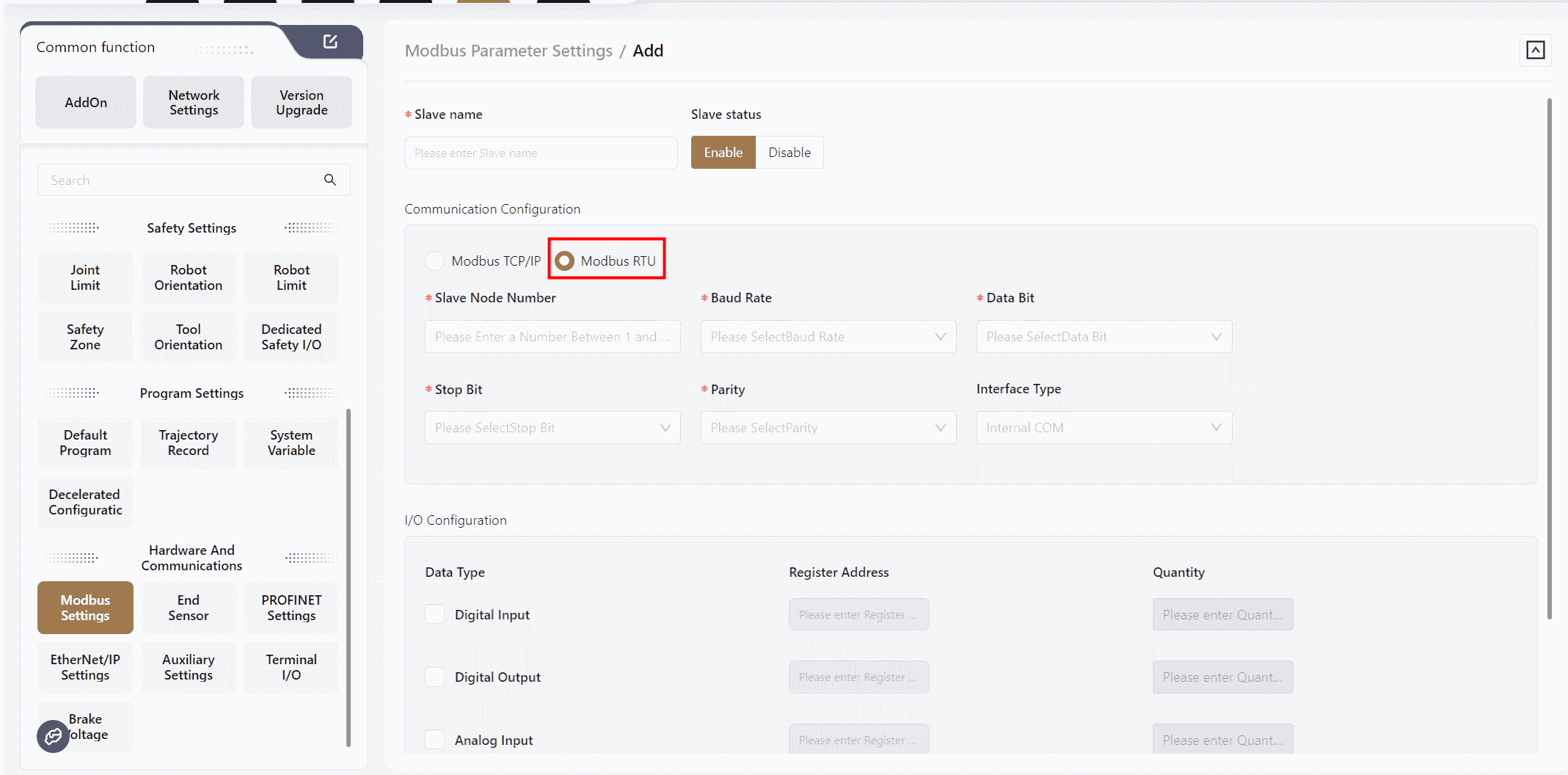 :Select the parity method for the configured Modbus RTU.I/O Configurations
