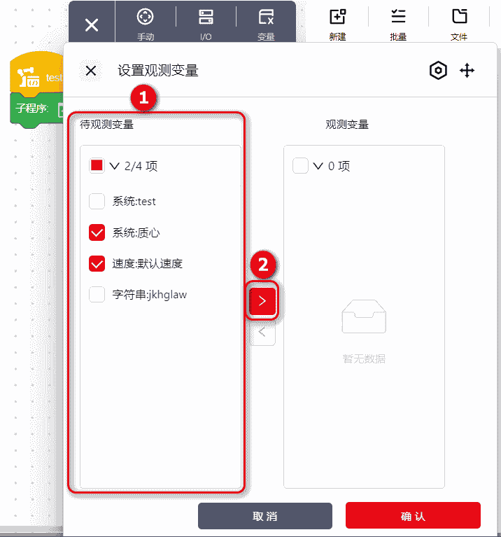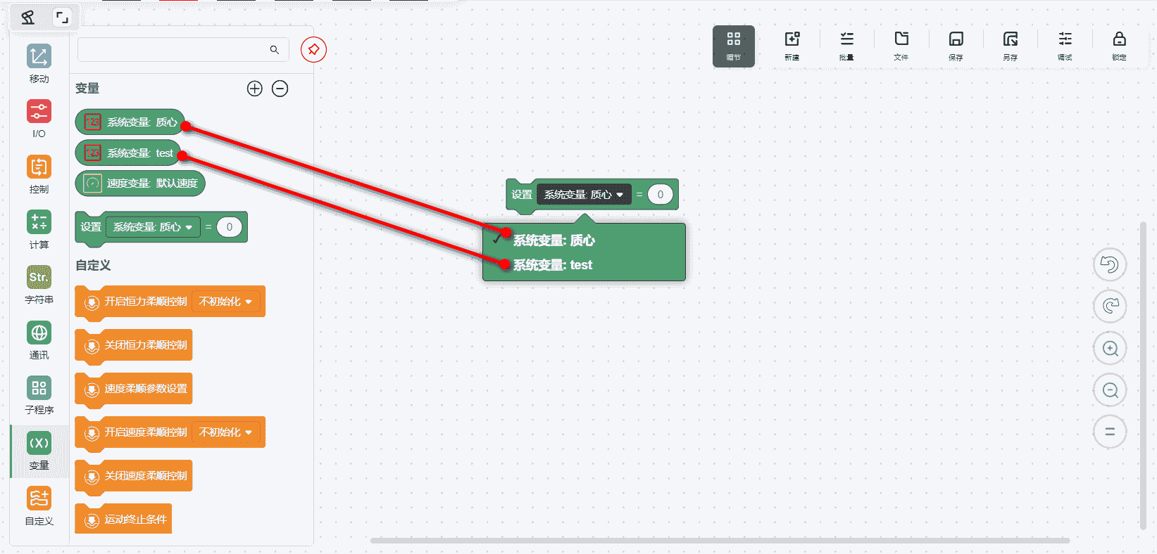 在左边指令栏中将该指令拖入操作页面,在下拉框中选择已新增好的变量类型,其他操作方法与其他指令相同。