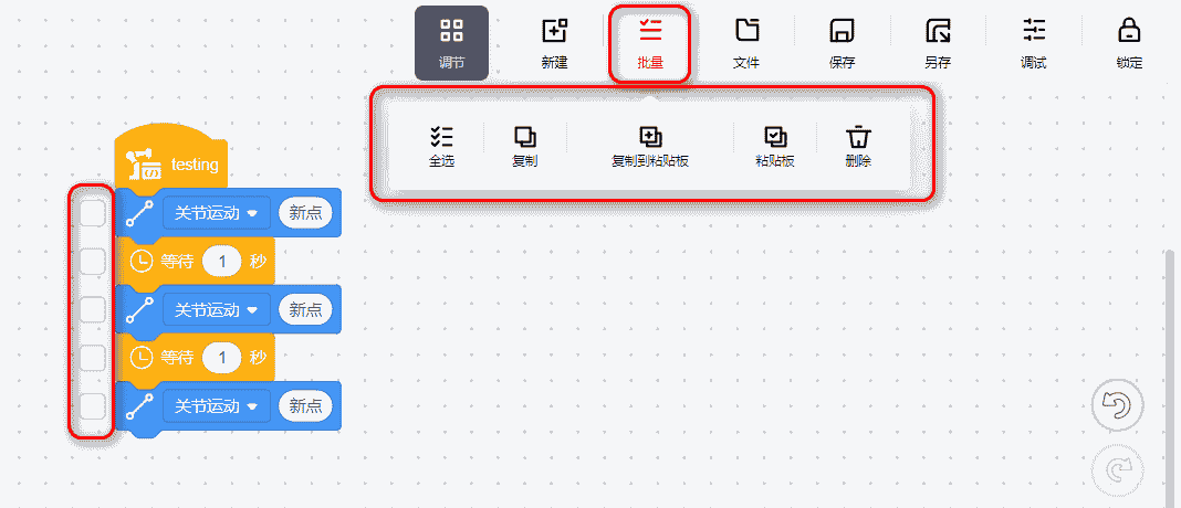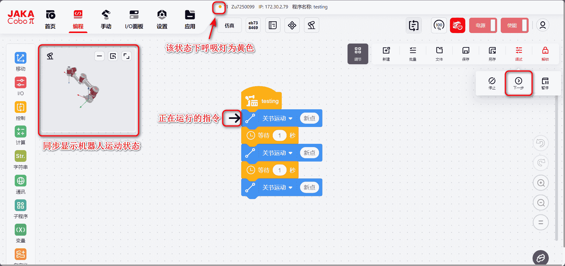 ,可使机器人进入调试状态,即每运行完一行指令后都会暂停,需要手动点击 下一步