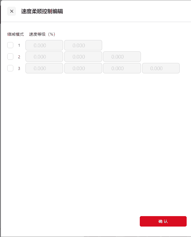 - 用法:配置减速等级阶梯,最多可配置三挡降速,当机器人末端受力大于控制力设定值时,机器人会进行减速,直至传感器检测值小于控制力设定值。用户可自行设置每次减速减至原始速度的百分比。