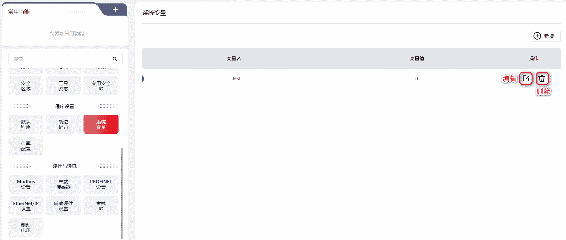 - 信号量定义完成后,可以通过调试界面进行调试或监控,也可以直接在作业程序中加以使用。两种方式均提供对信号量的刷新与查询接口。刷新操作将实际触发控制器与TIO夹爪间的数据交互。由于控制器与TIO外部设备间的交互过程同刷新操作指令是异步的,因此刷新后,需要等待一定时间(推荐100ms)以保证获取刷新后的值。