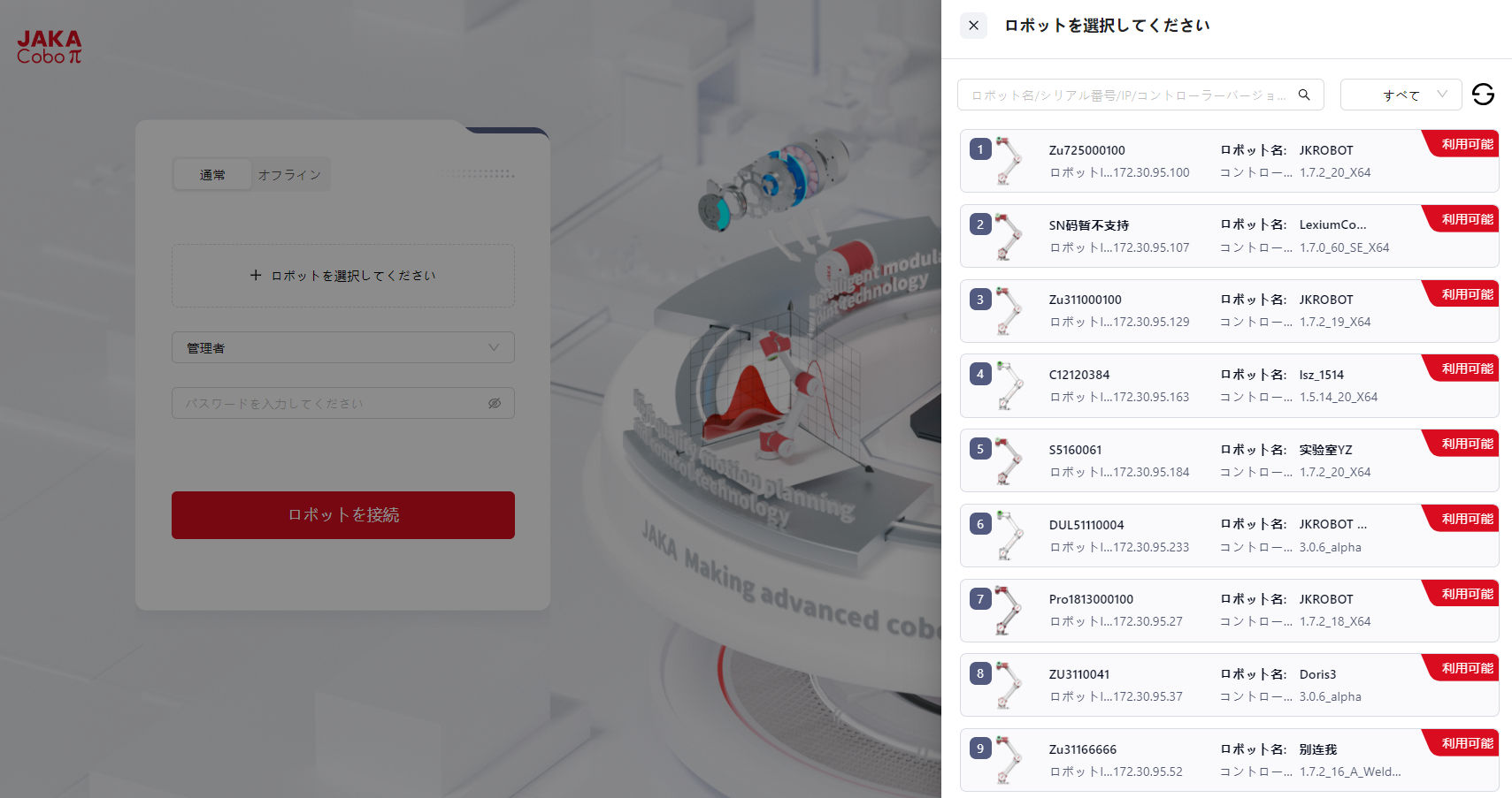 右側にロボットのリストが表示されます。ユーザーはリストから目的のロボットを直接選択するか、ボックス内で検索/フィルタリングできます。