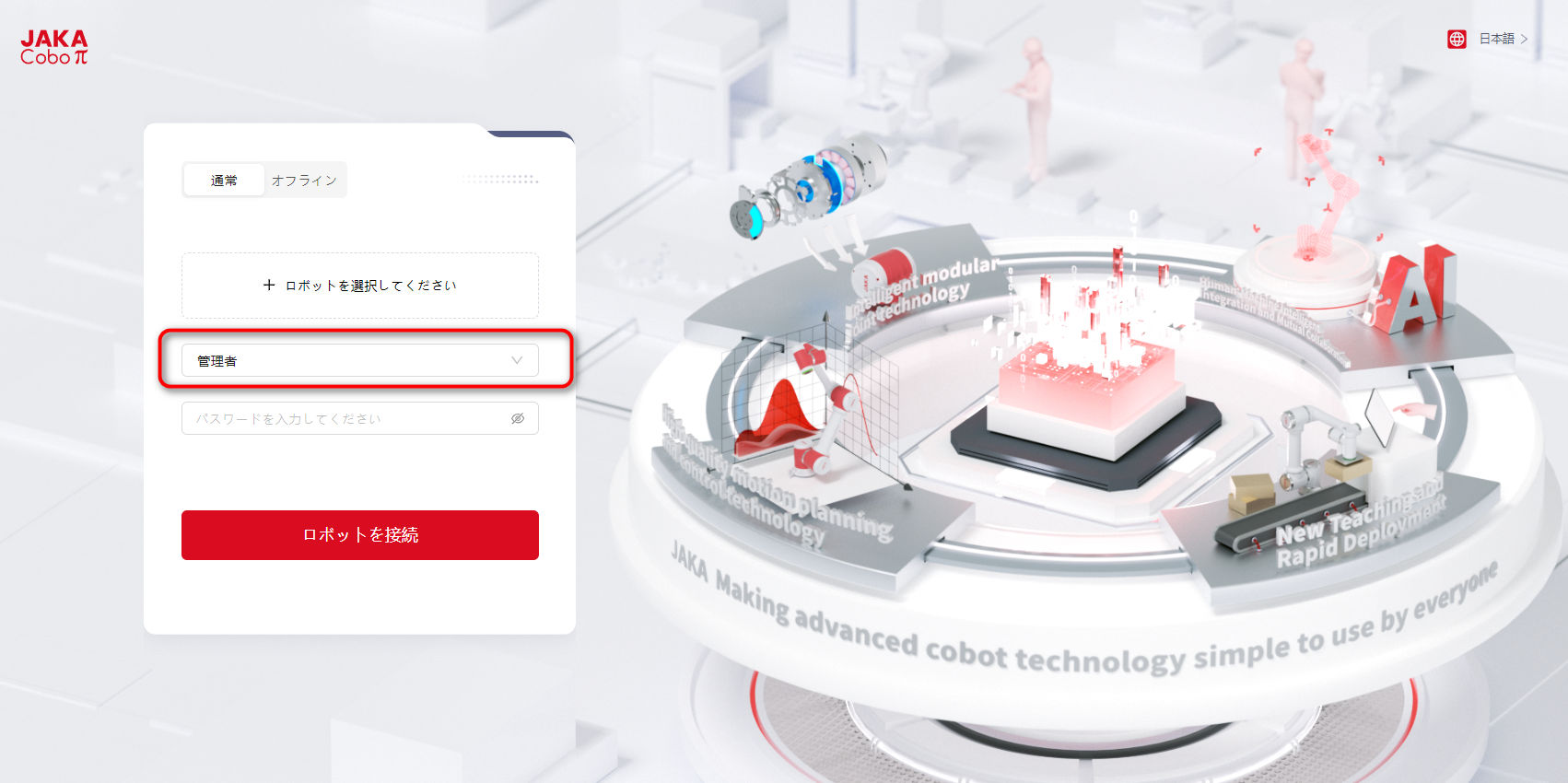 ロボットを選択した後、役割ドロップダウンメニューから「管理者」、「技術者」、または「オペレーター」を選択します。