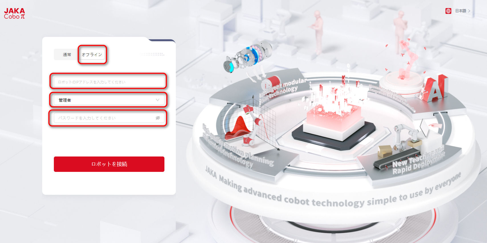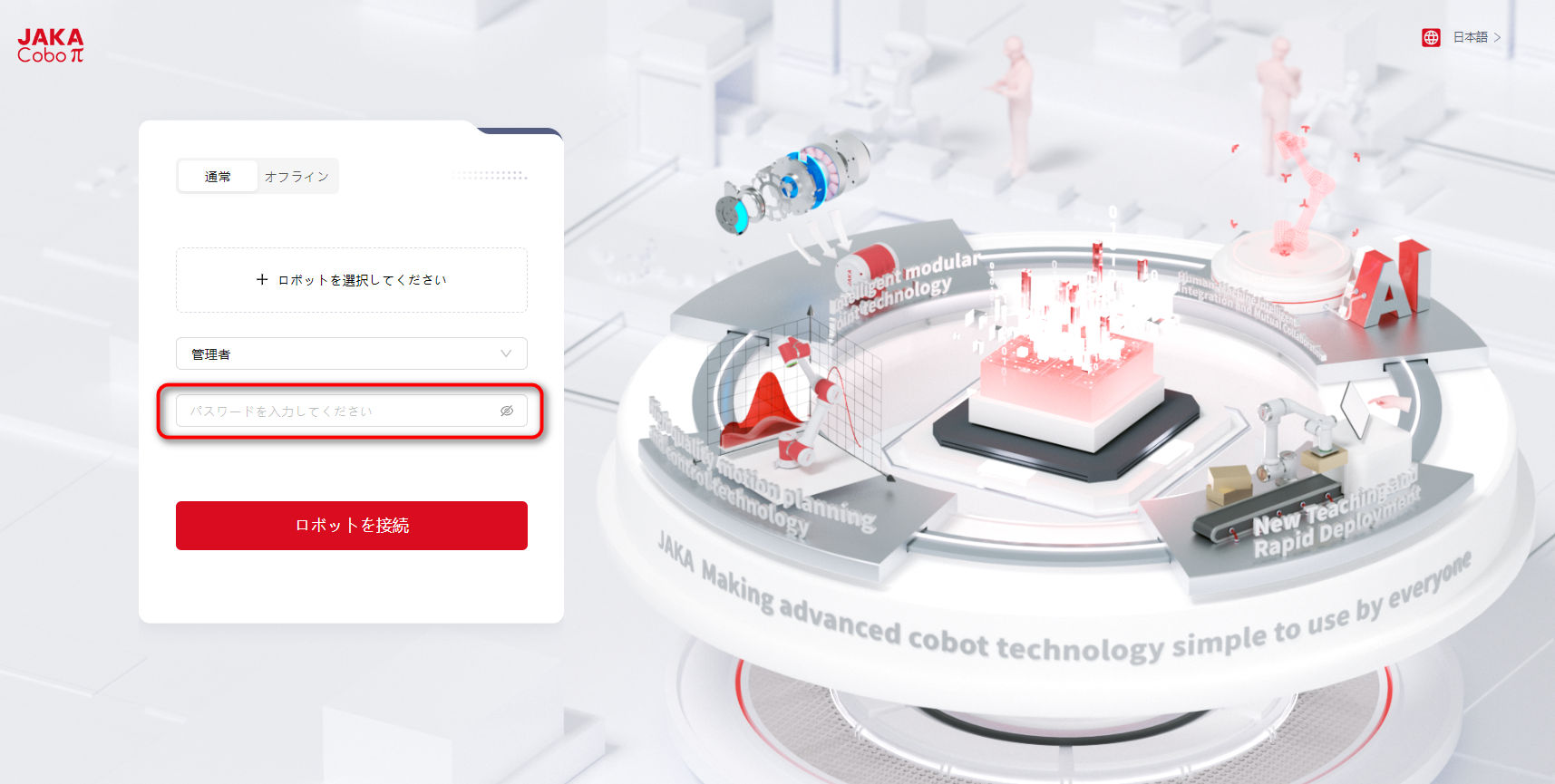 - パスワードを入力し、「ロボットの接続」をクリックします。