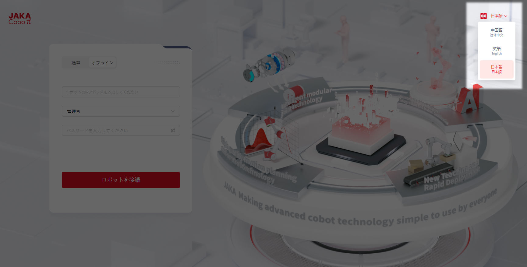 ユーザーは言語選択ボックスで言語を切り替えることができます。Coboπは現在、中国語、英語、日本語をサポートしています。