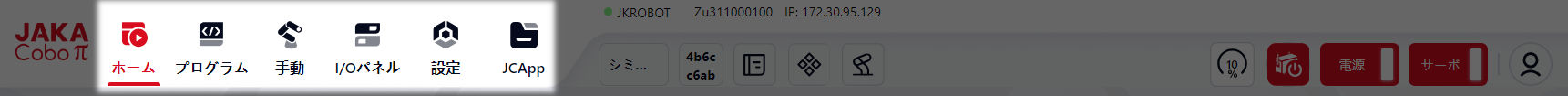 メインメニューバーには、以下の6つの主要セクションが含まれています:ホーム、プログラム、マニュアル、I/O、設定、アプリケーション。