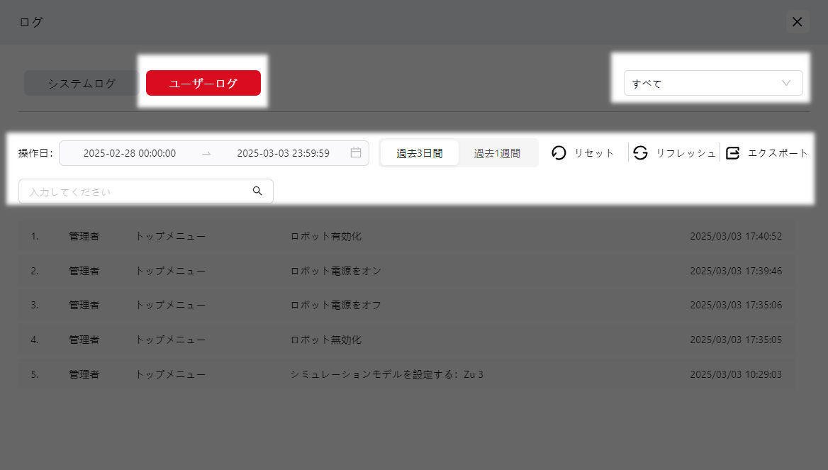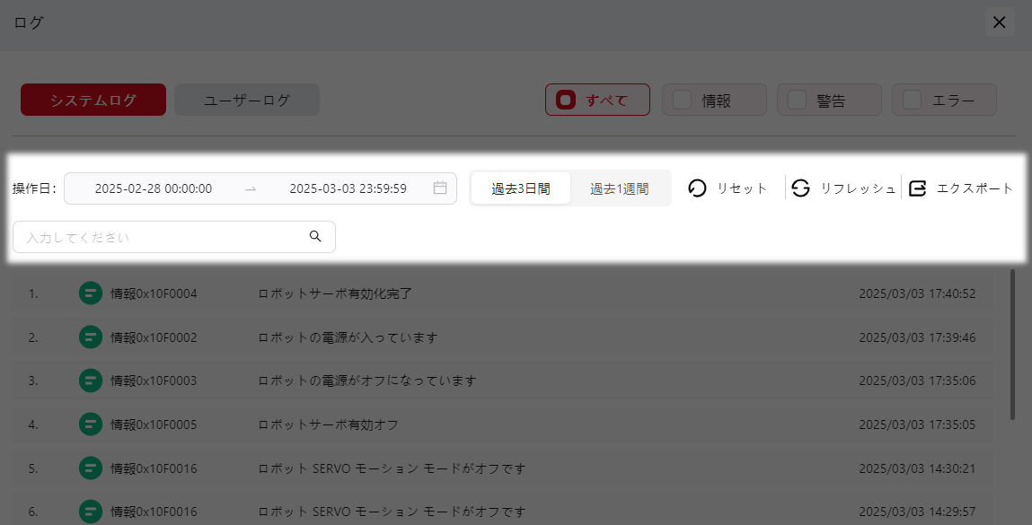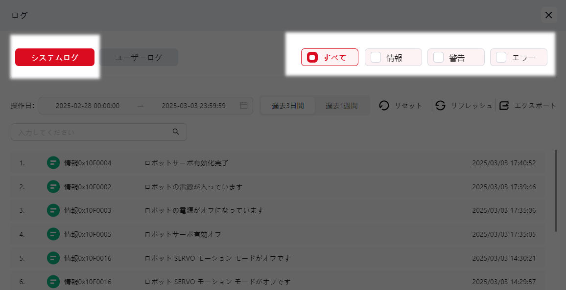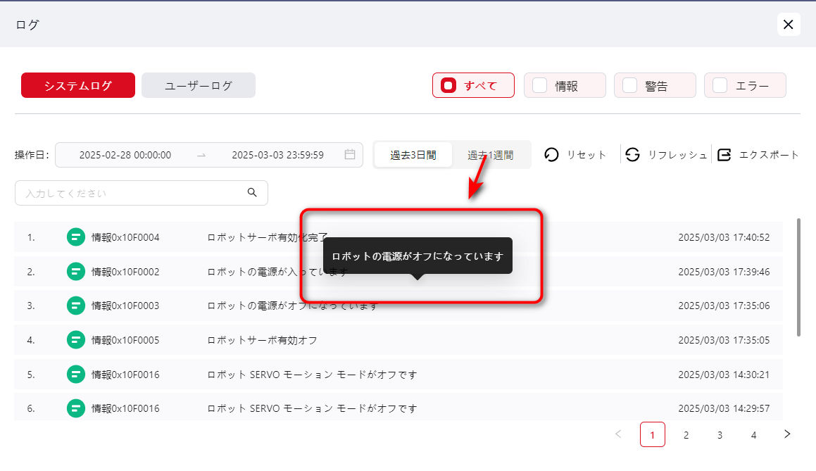 上記のアイコンをクリックしてロボットのログにアクセスしてください。ログには、システムログとユーザーログが含まれています。