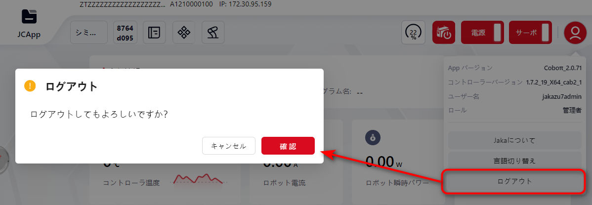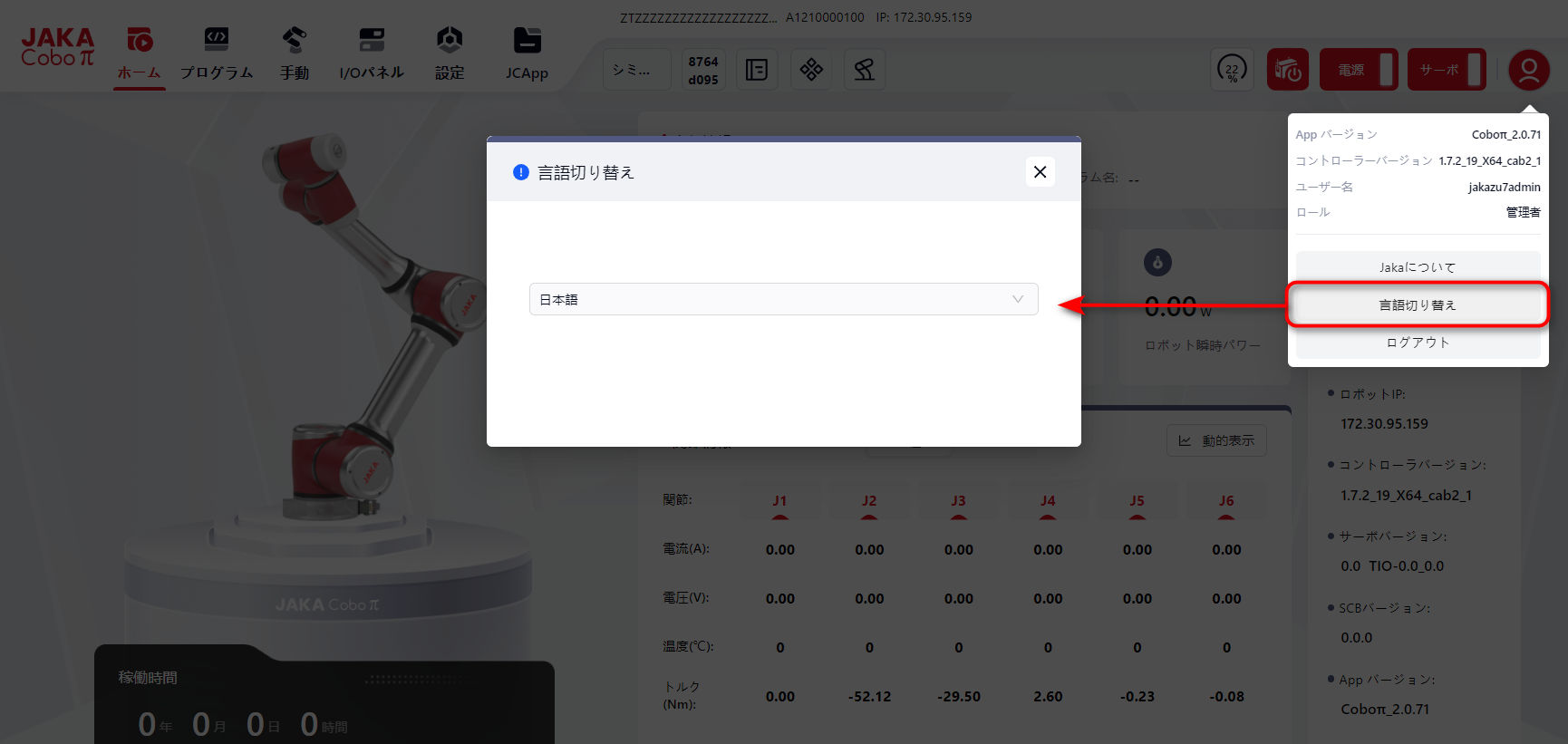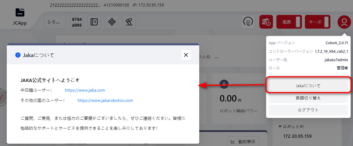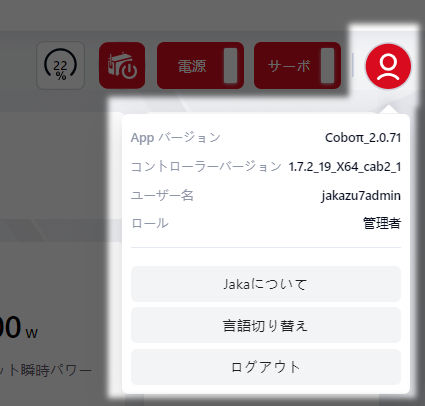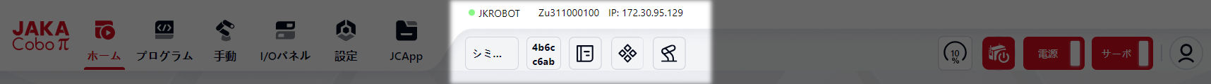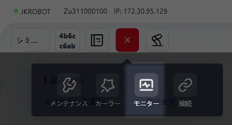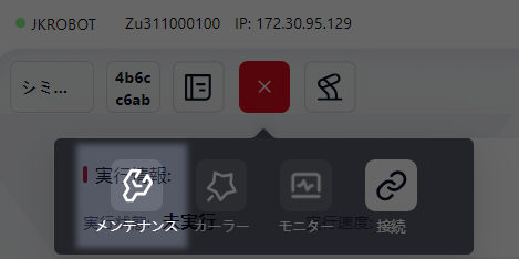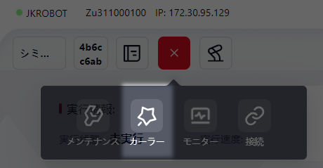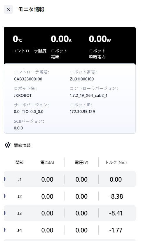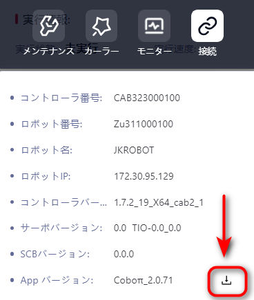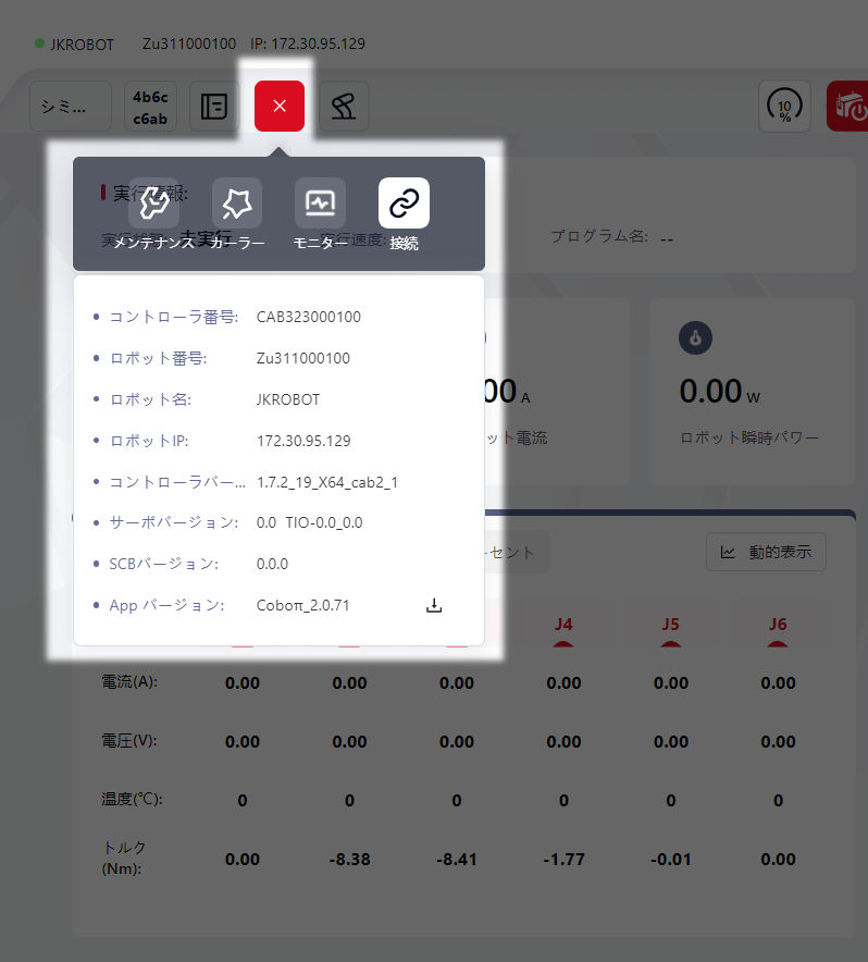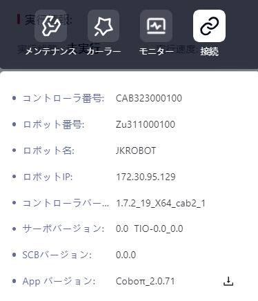 このアイコンをクリックしてロボットの詳細情報を表示します。情報には、ロボット名、ロボットID、ロボットIP、コントローラーバージョン、サーボバージョン、およびSCBバージョンが含まれます。