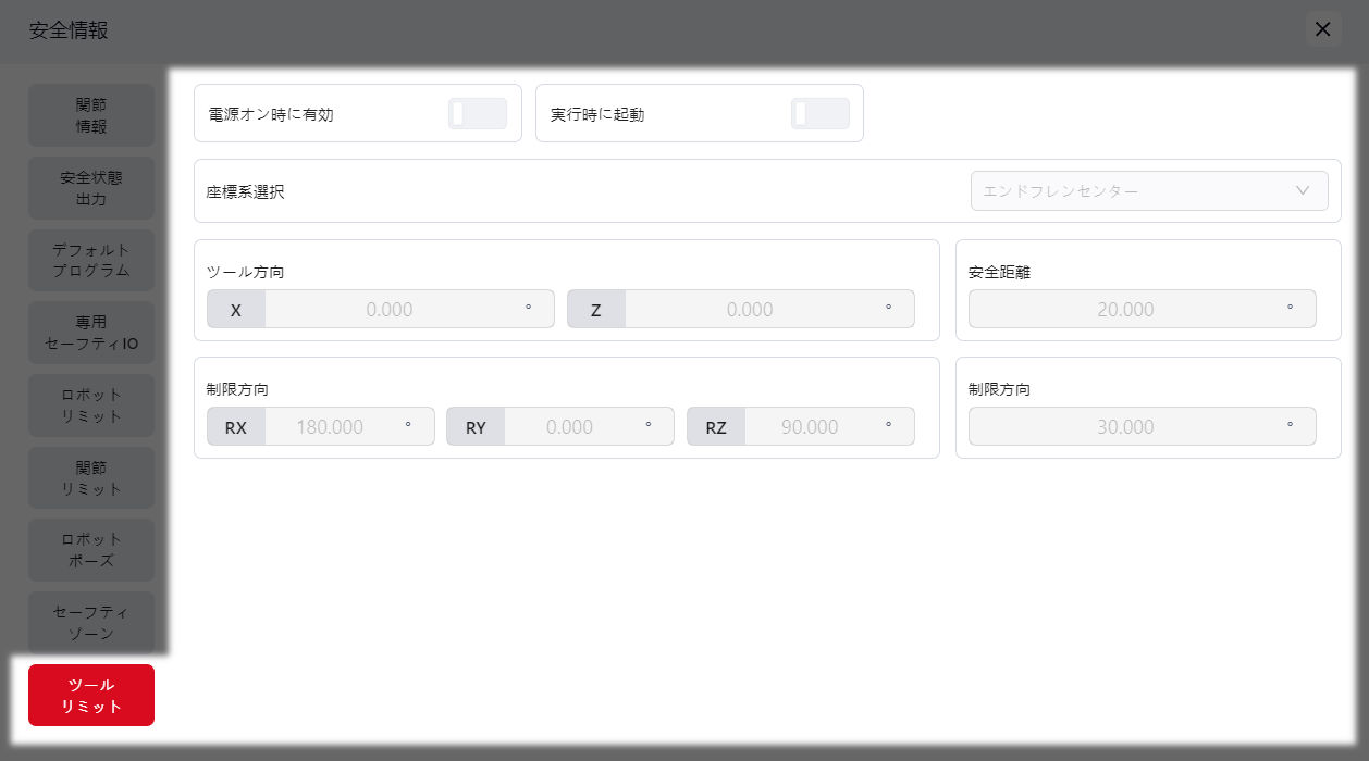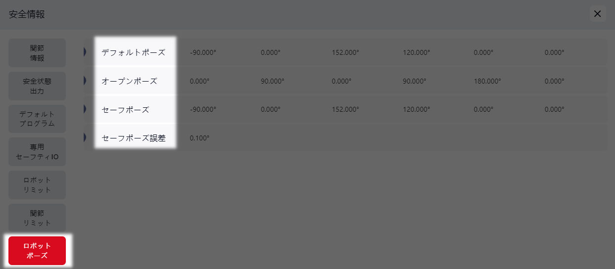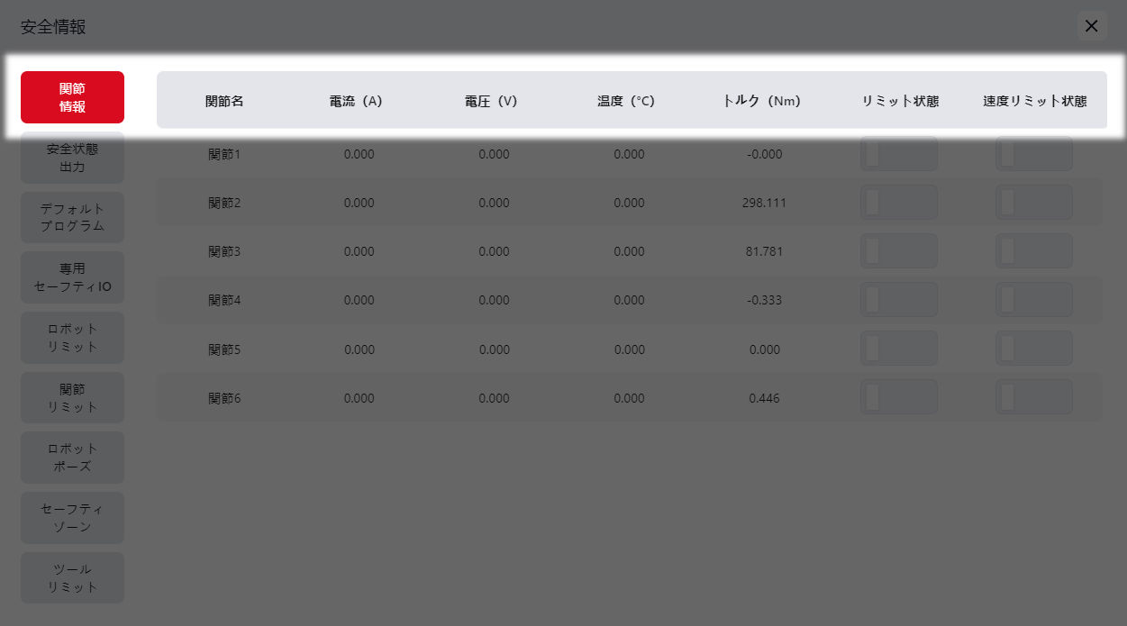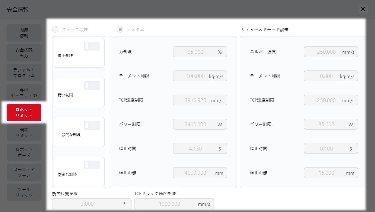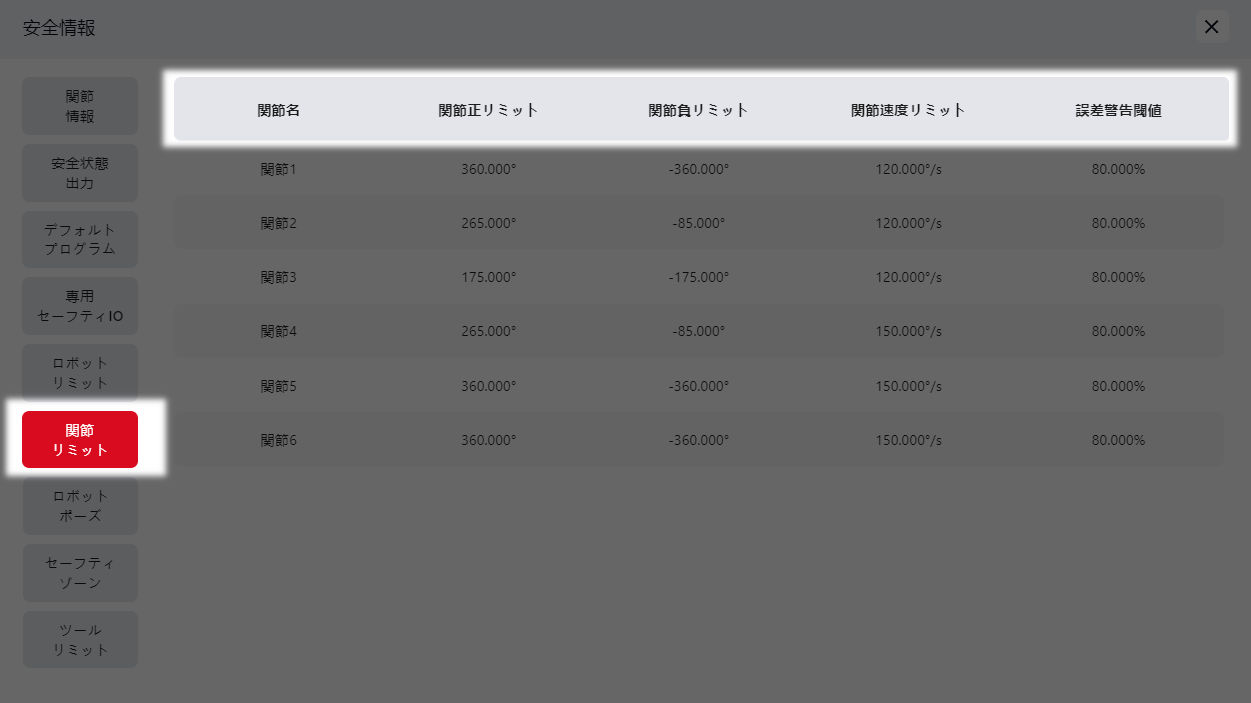 このページには、現在ロボットに適用されている動作制限が表示されます: