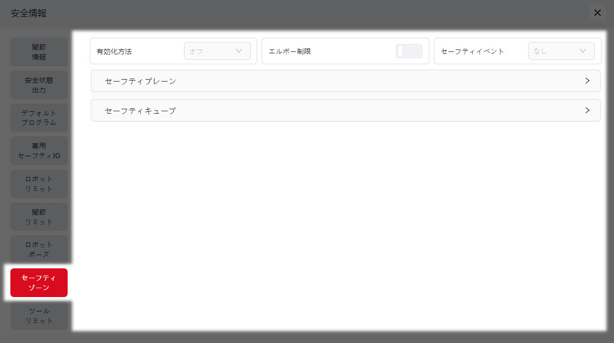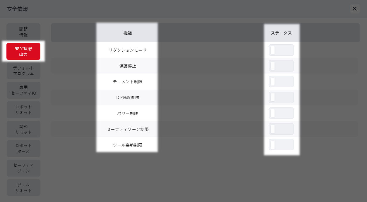 このページには、ロボットが現在いる安全関連の状態が表示されます:
