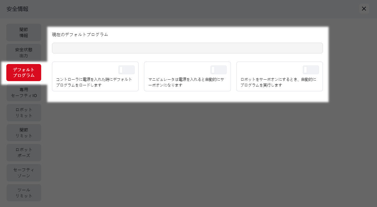 このページには、ロボットが現在の状態で実行するために選択されたデフォルトプログラムが表示されます。選択されたプログラムは濃い灰色で表示され、選択されていないプログラムは薄い灰色で表示されます。