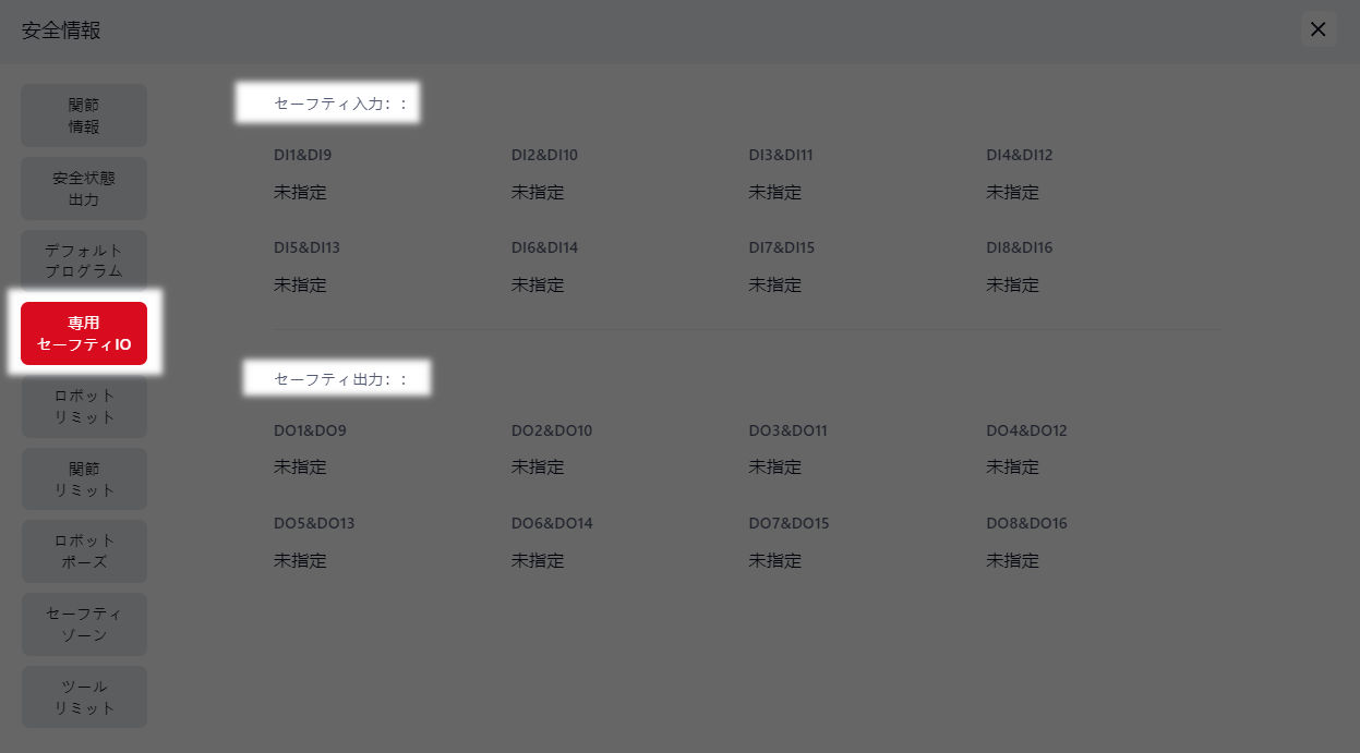 このページには、ロボットの専用安全I/Oの信号状態が表示されます: