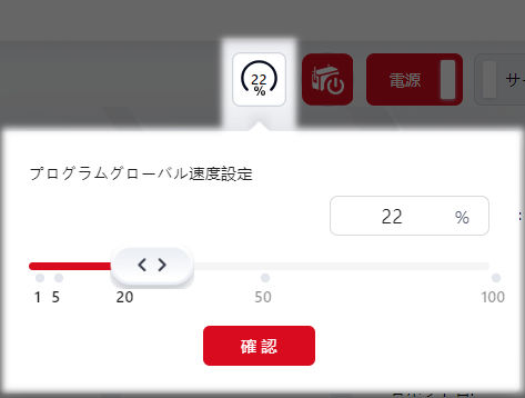 このアイコンをクリックして、プログラム内でロボットの動作速度を制御します。1から100の範囲で値を入力するか、スライダーを調整して速度を変更できます。