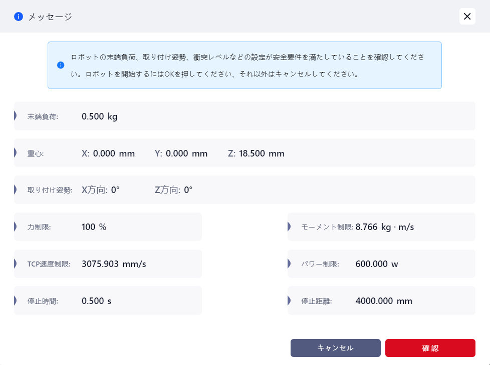 電源オンボタンをクリックすると、ポップアップが表示されます。ポップアップ内でロボットの関連情報(最終負荷、重心、取り付け向き、力制限、TCP速度制限、運動量制限、電力制限)を確認し、**OK