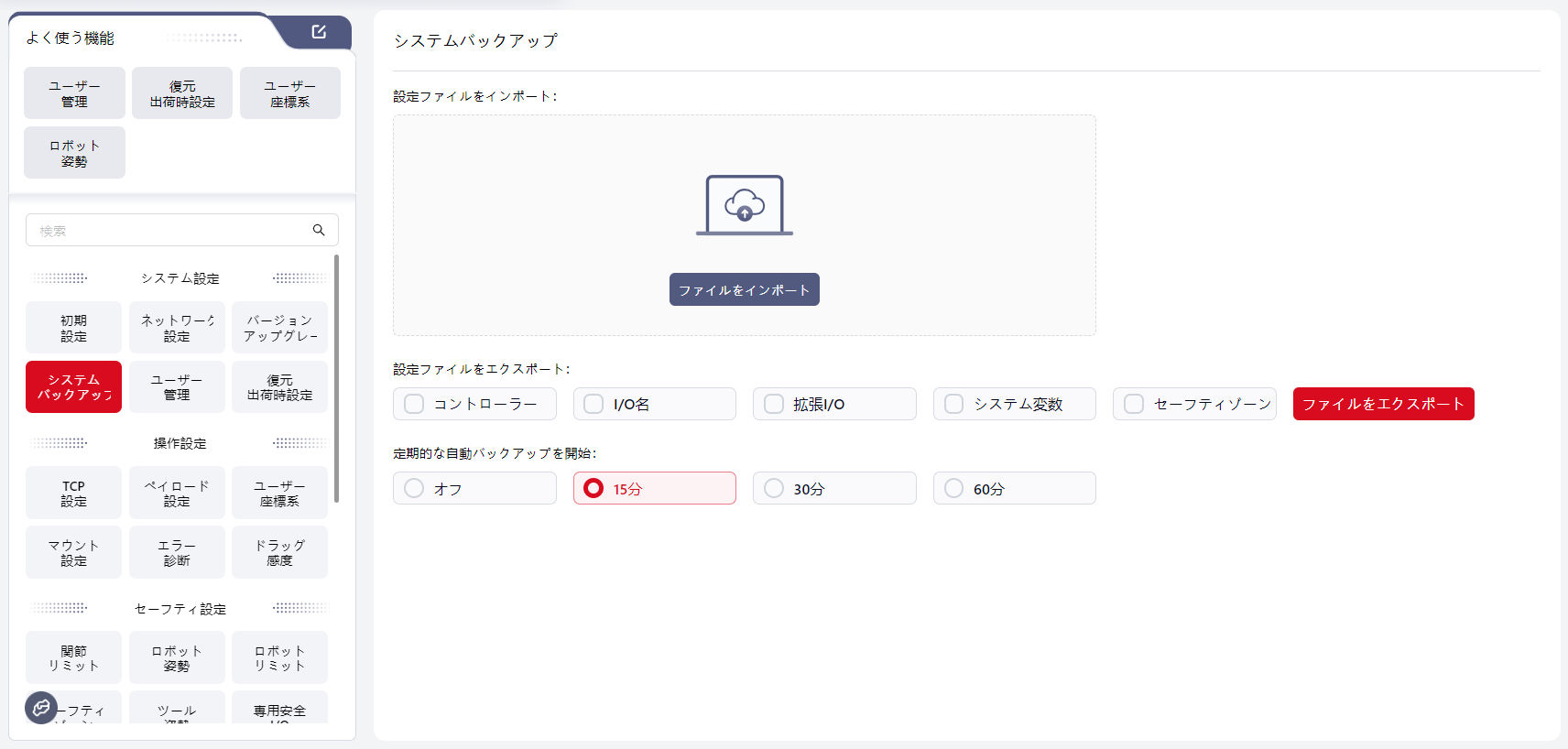 システムバックアップには、設定ファイルのインポート/エクスポート
