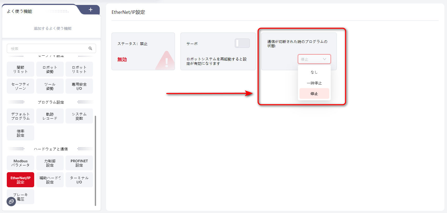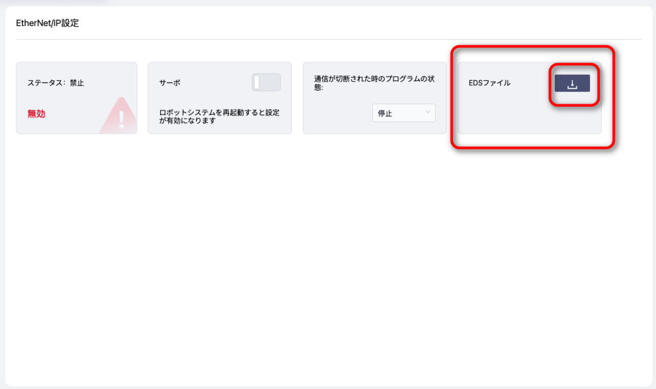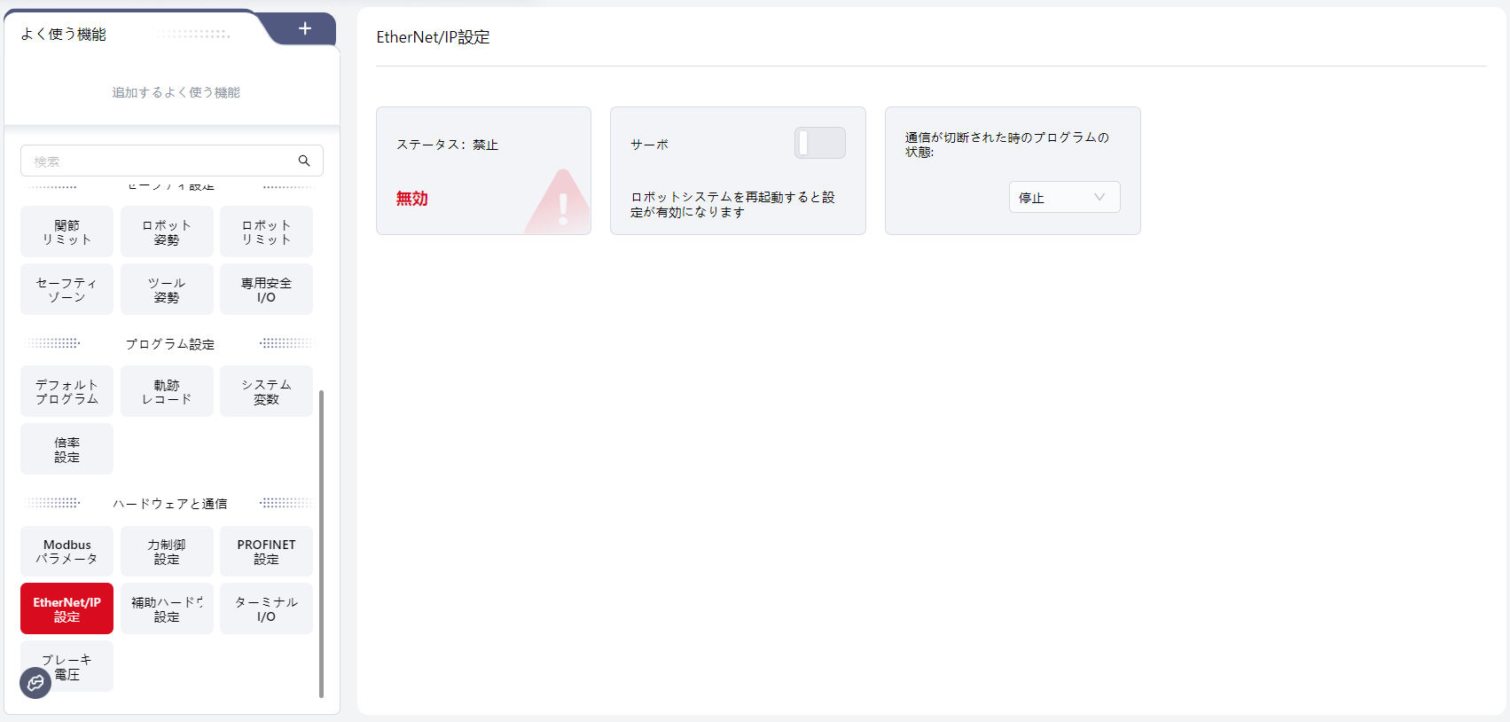 制御キャビネットの下部のネットワークポートに接続した後、このページにアクセスして EtherNet/IP 機能を有効にします。有効にした後、設定を適用するために制御キャビネットを再起動する必要があります。EtherNet/IP が有効になると、外部 PLC と通信が可能となり、その I/O 情報は I/O パネル