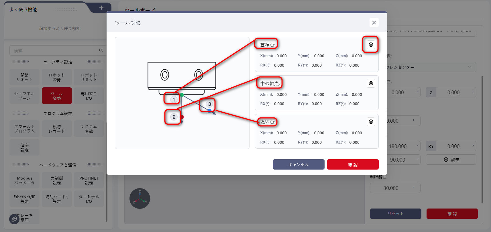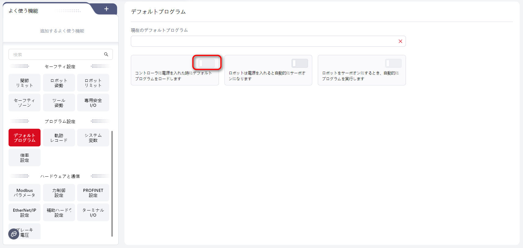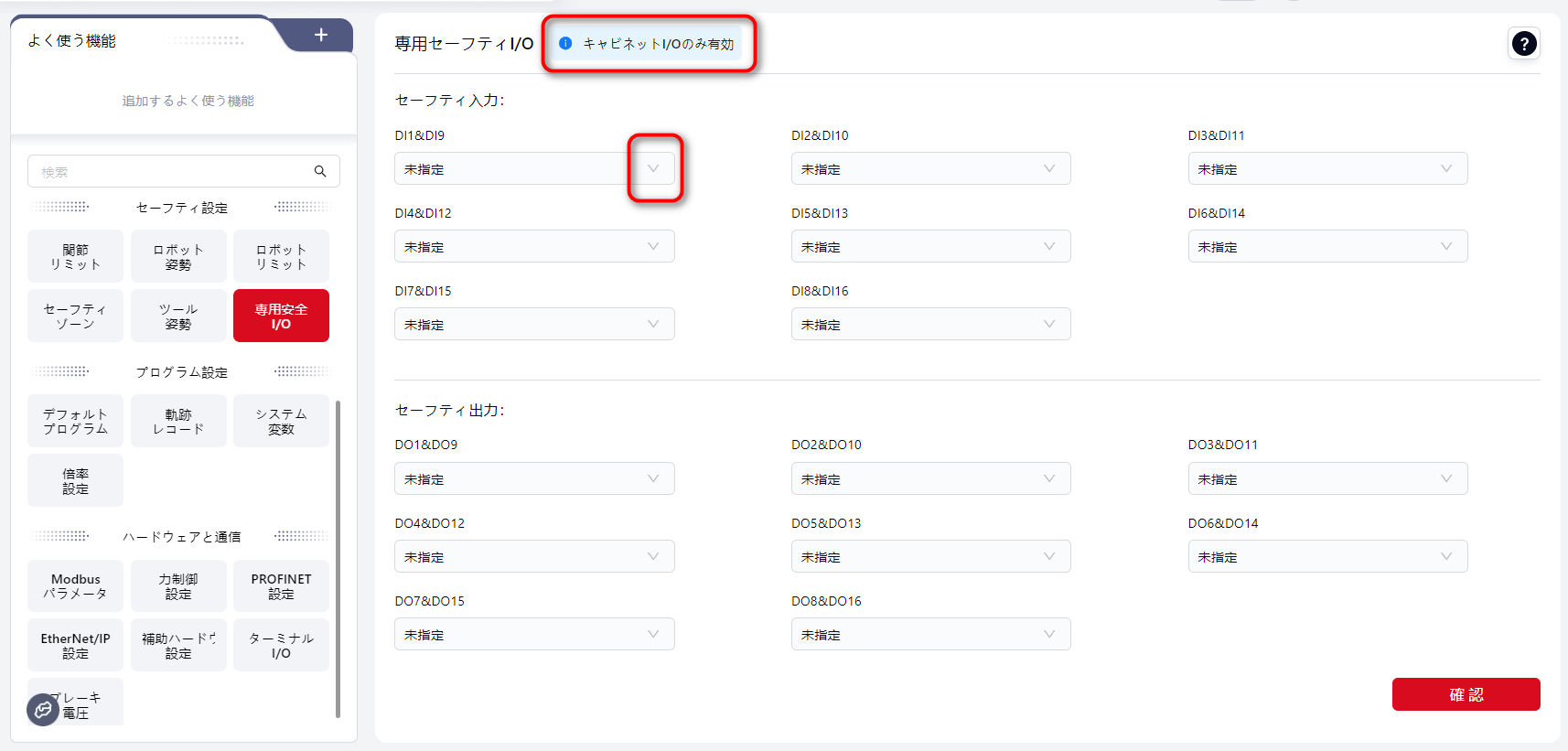 。これらのボタンの機能と、制御キャビネットの電源電圧は、このインターフェースで設定できます。