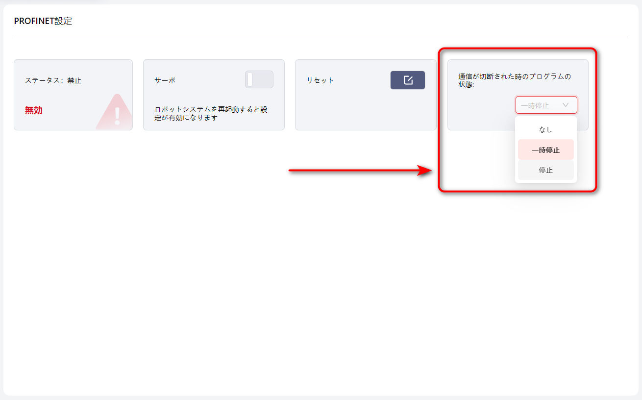 バージョン 172 では、通信が中断された場合にプログラムの動作を設定できるオプションが以下の通り提供されています: なし、停止、または再開。