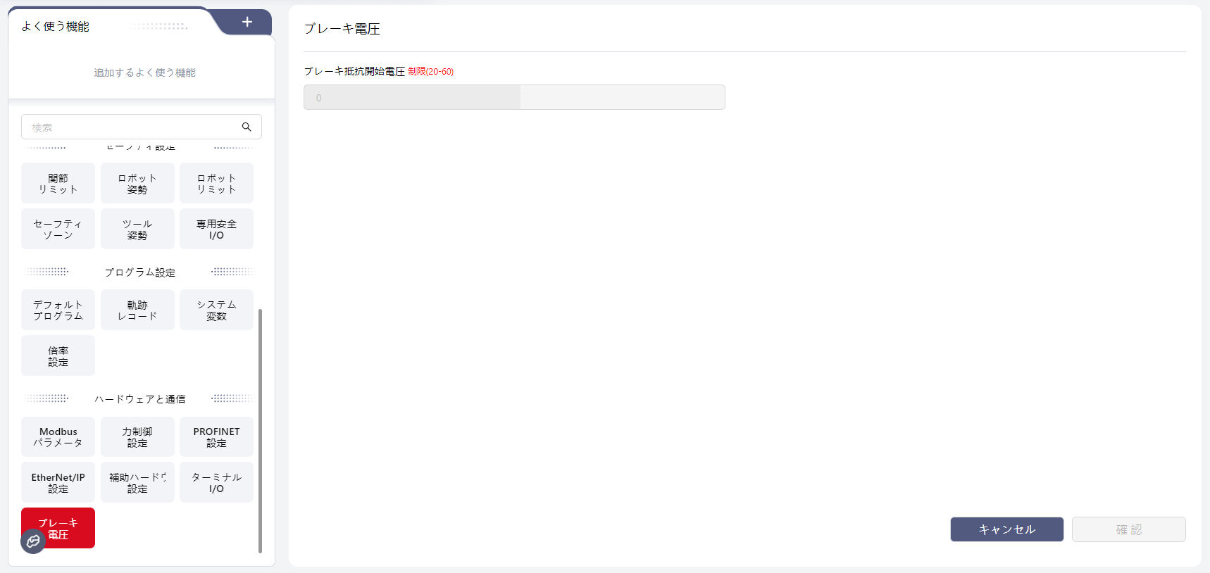 MiniCabには、ロボットの減速およびブレーキ時に発生する起電力を分散させるための電圧ブレーキ回路が統合されています。外部電源を使用する場合、MiniCabのブレーキ電圧を設定する必要があります。設定を行わないと、過電圧保護によるシャットダウンやコントローラーの損傷が発生する恐れがあります。