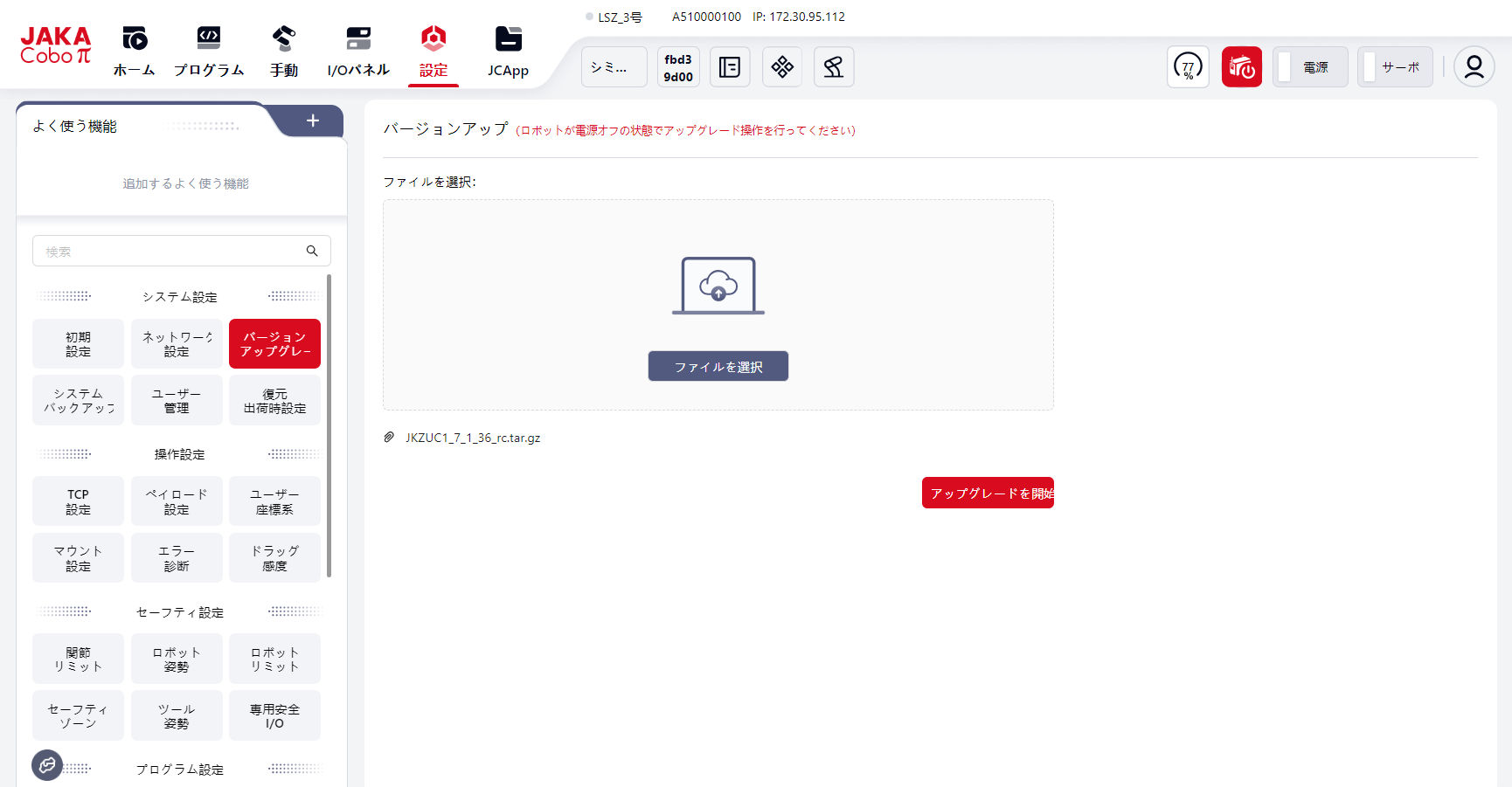 ::: 警告: アップグレード前に、SCBとPSCBのバージョンを確認してください。もしSCBのバージョンが02_50未満、またはPSCBのバージョンが02_00未満の場合、アップグレードは行わないでください。JAKA技術サポートチームに連絡して、支援を受けてください。 :::
