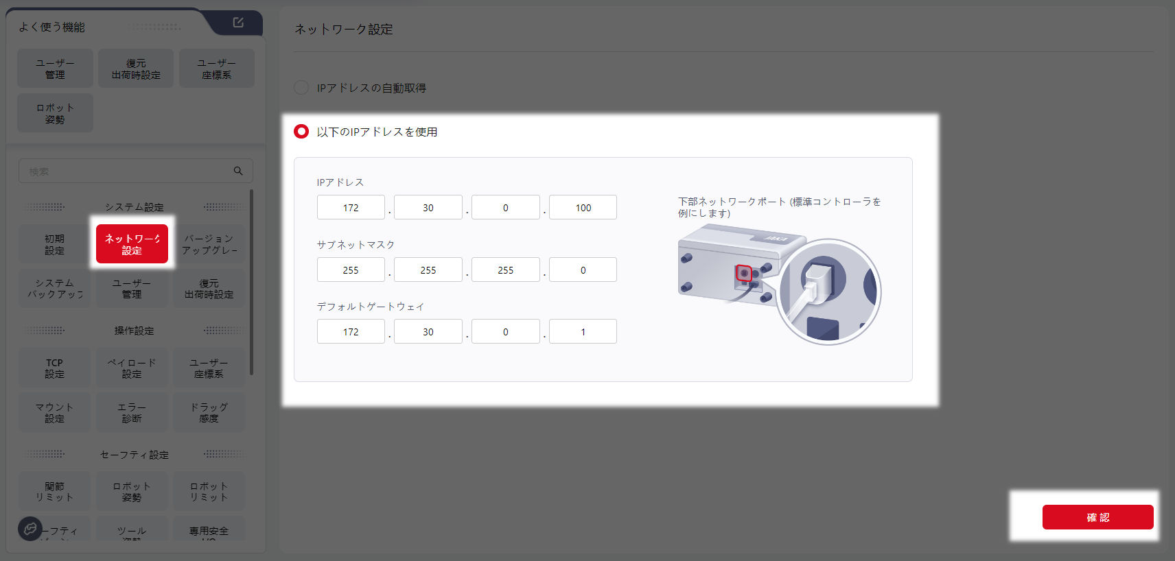 - 静的IPアドレスを設定する前に、ロボットが電源オフで無効になっていることを確認してください。