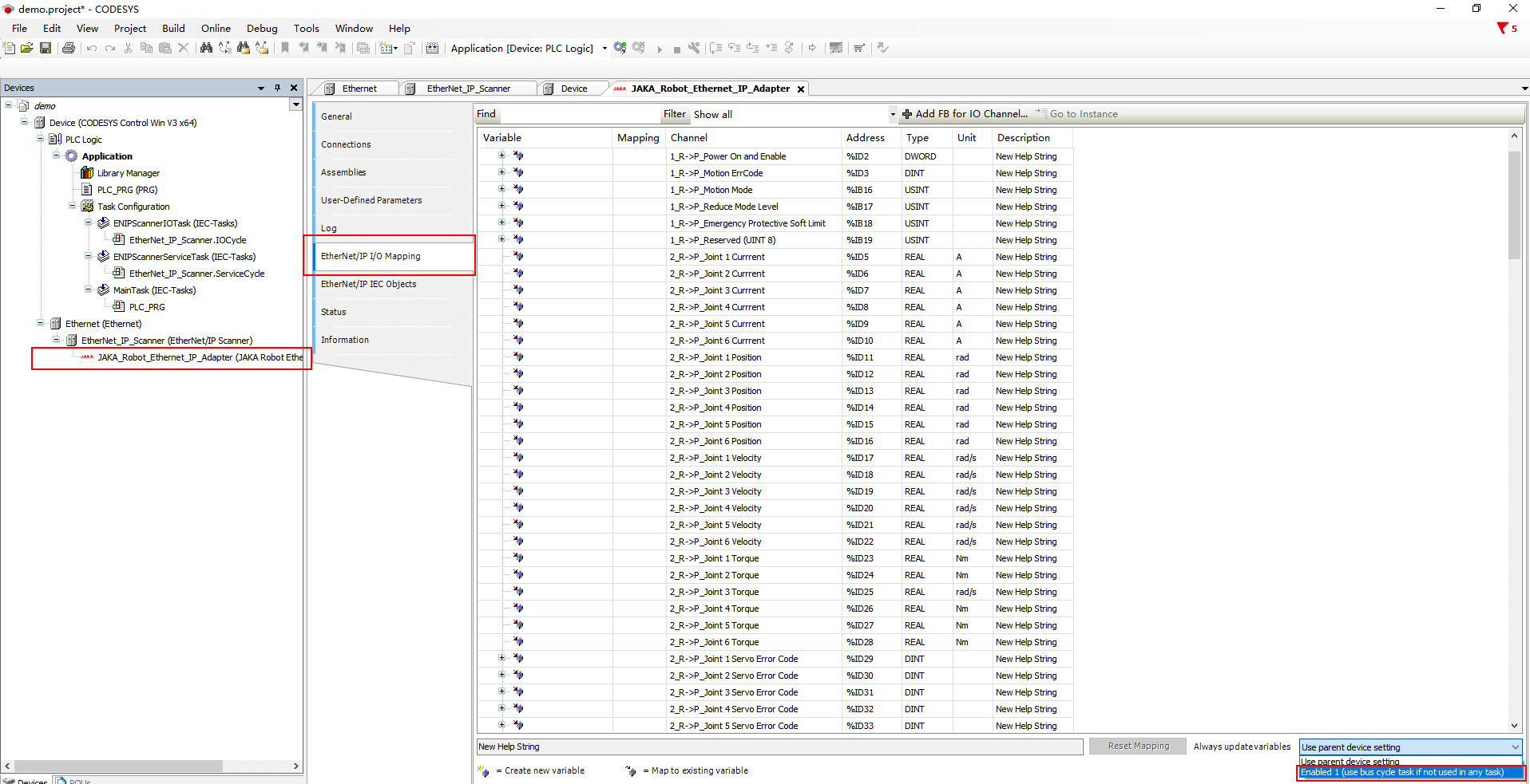 - Open the IO mapping of the jaka adapter and change “Always update variables” to “Enabled 1”. To modify this option, you need to log out of the PLC first. If you log in again, you can find that the data has been updated synchronously.