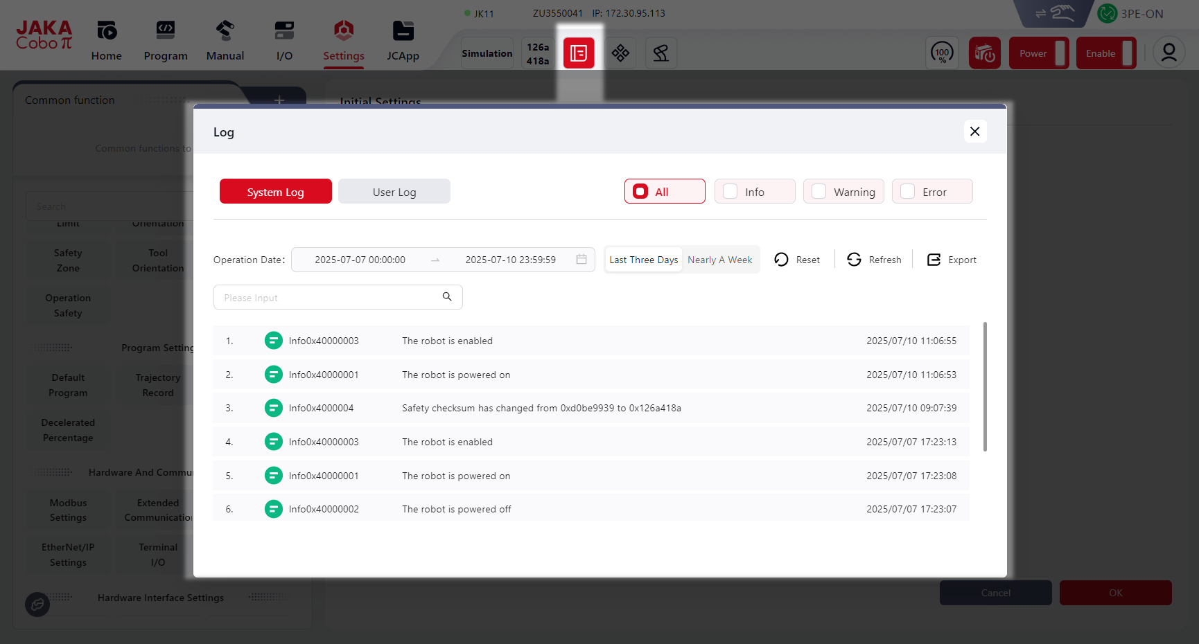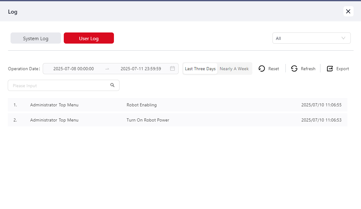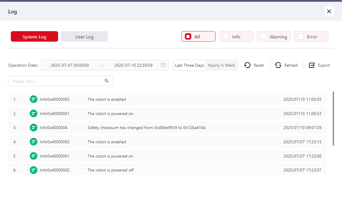 By clicking the download icon on the lower right side, users can download the system operation log to local device, preparing for the need of the technical service team when debugging.