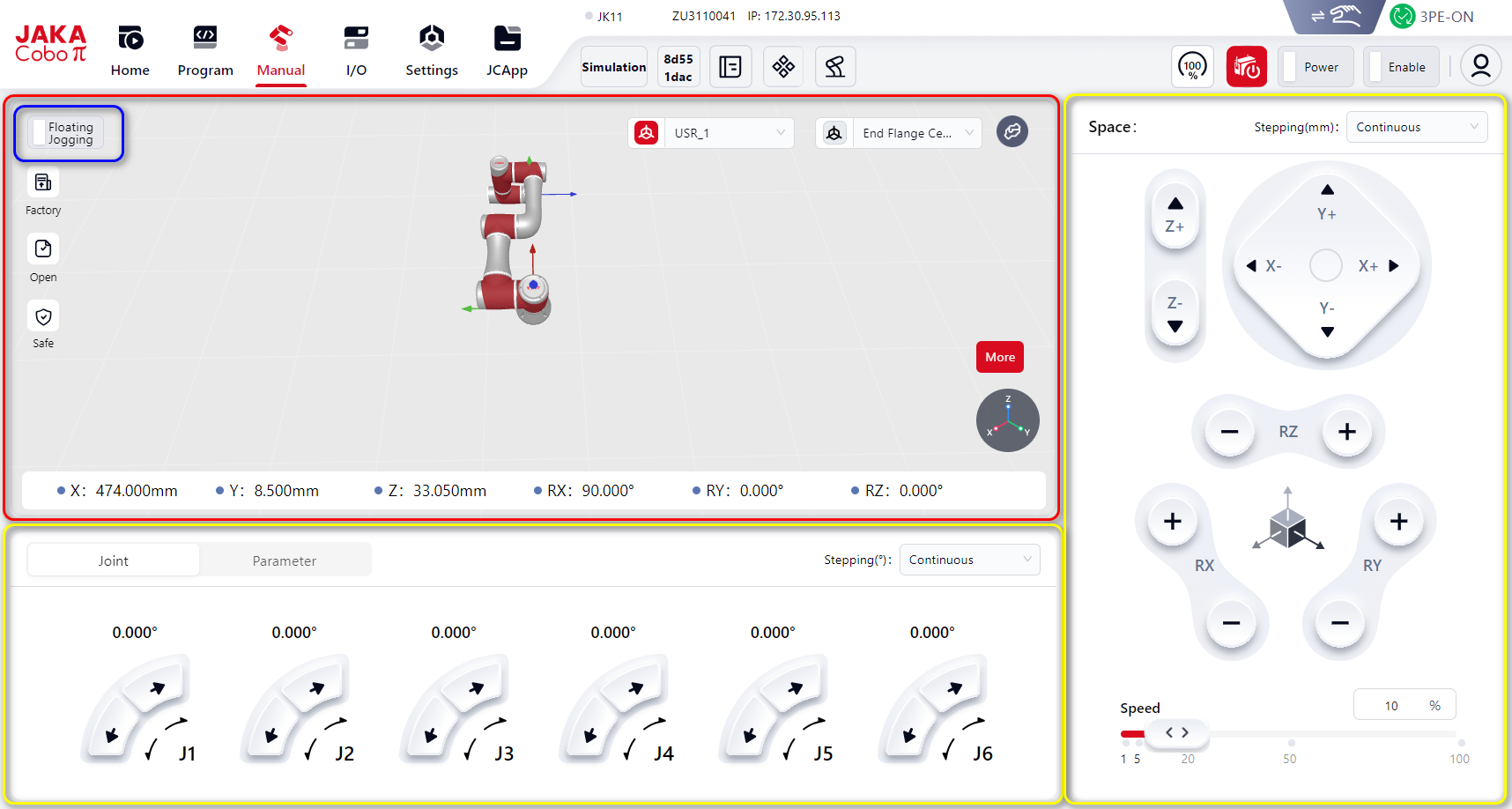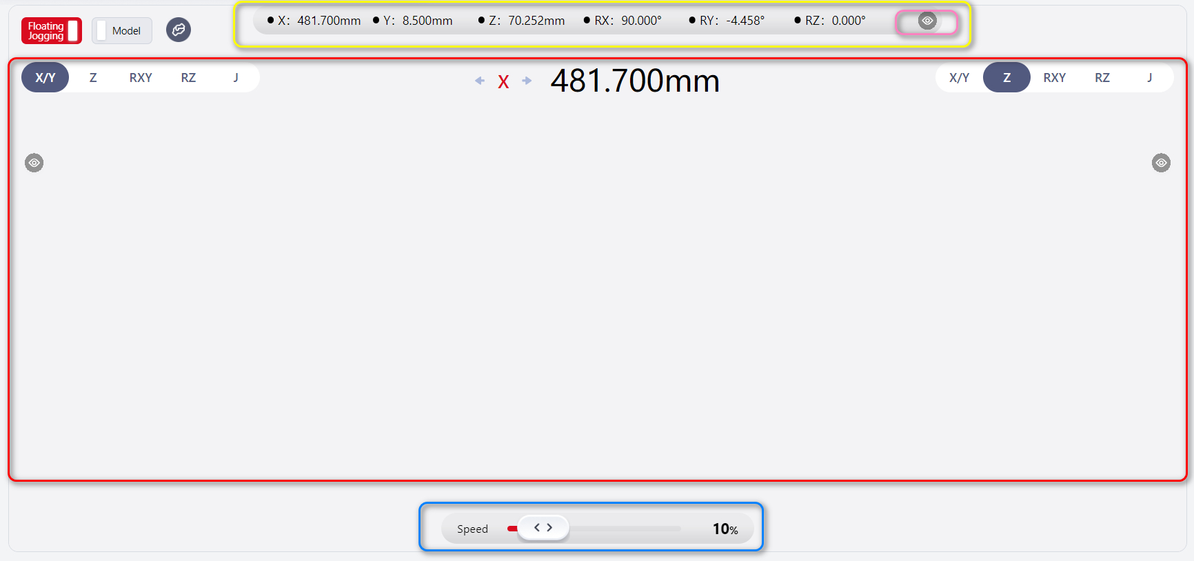 Blue box: Floating Jogging function button. Click to enter floating jogging mode.