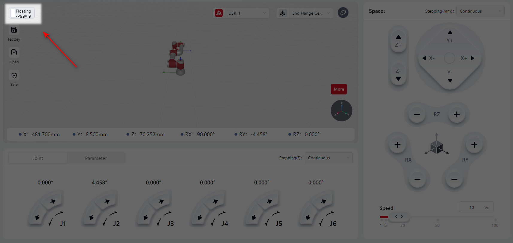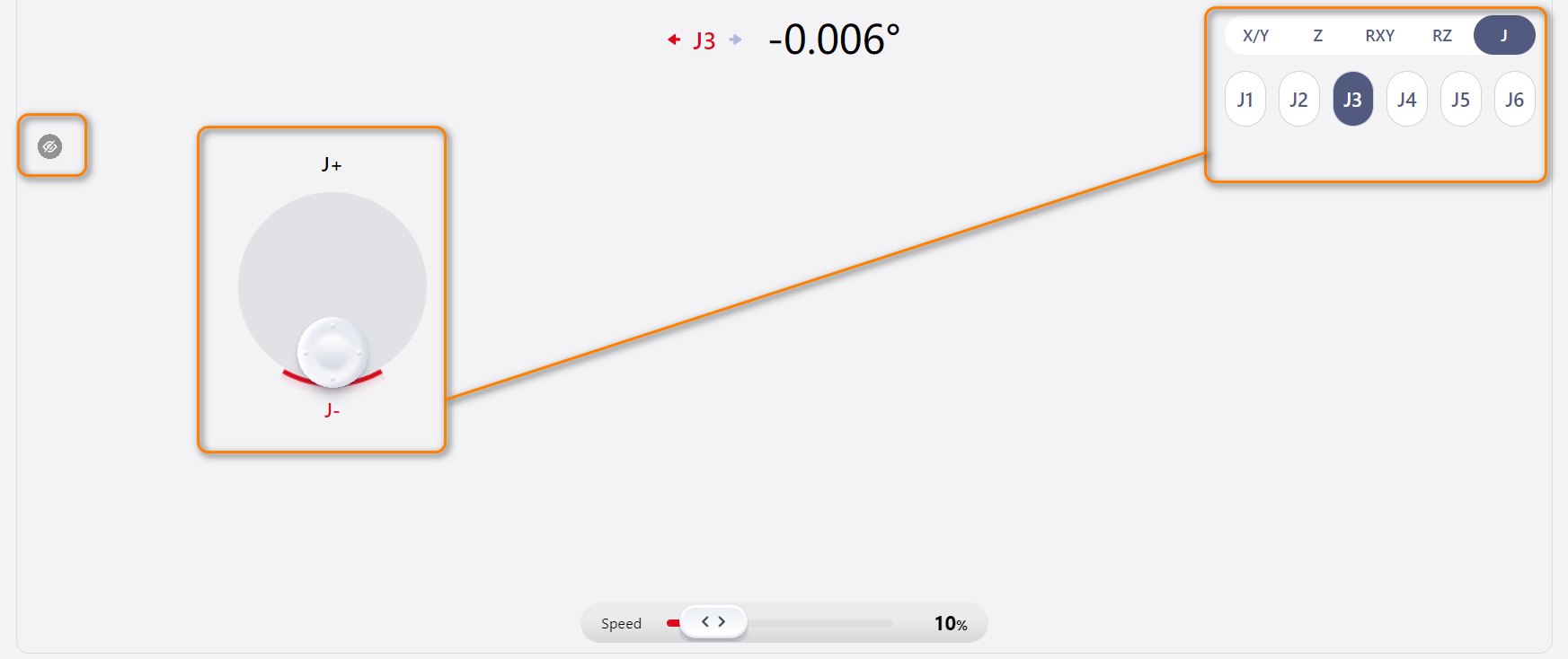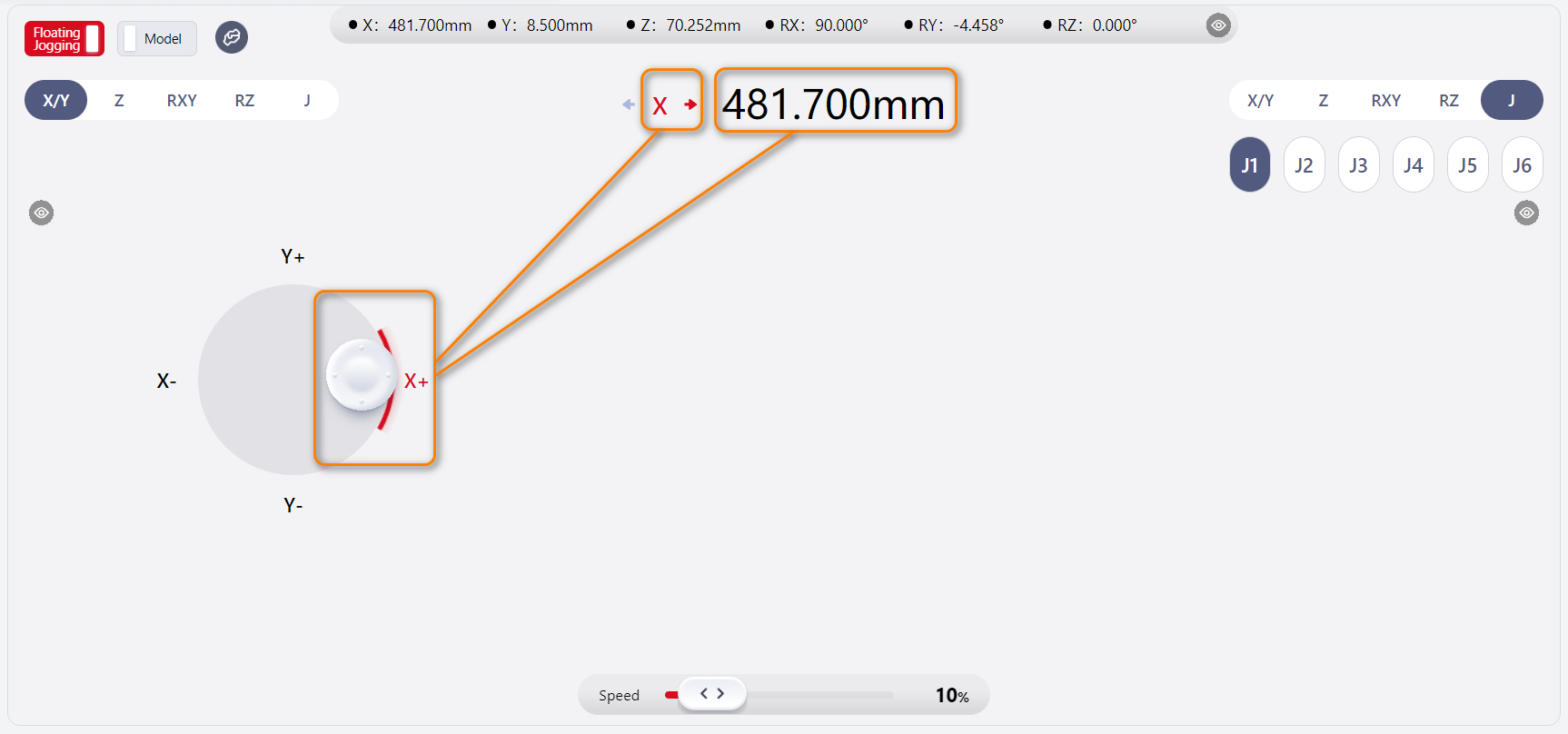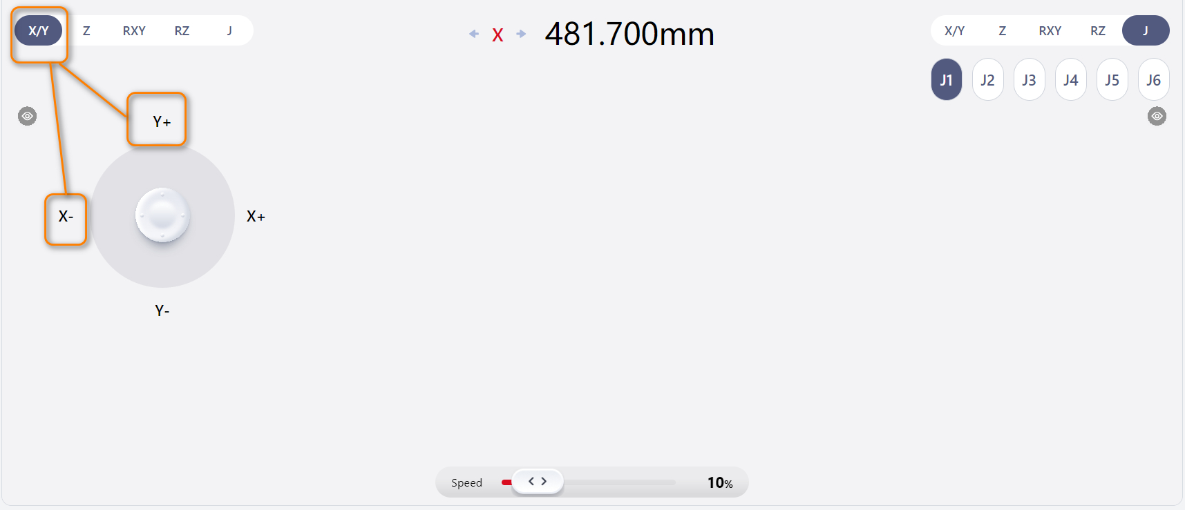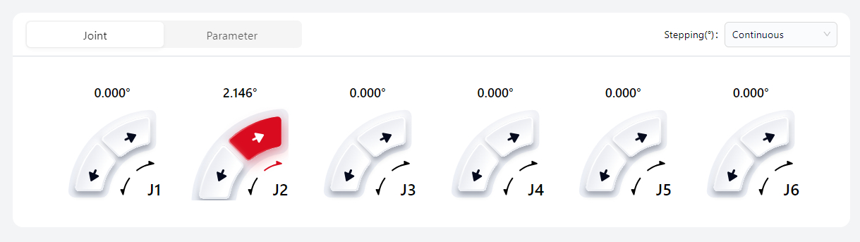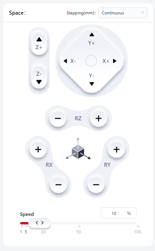 You can set at stepping for user-define motion or continuous motion, or a specific value, and adjust the robot's moving speed at Speed.