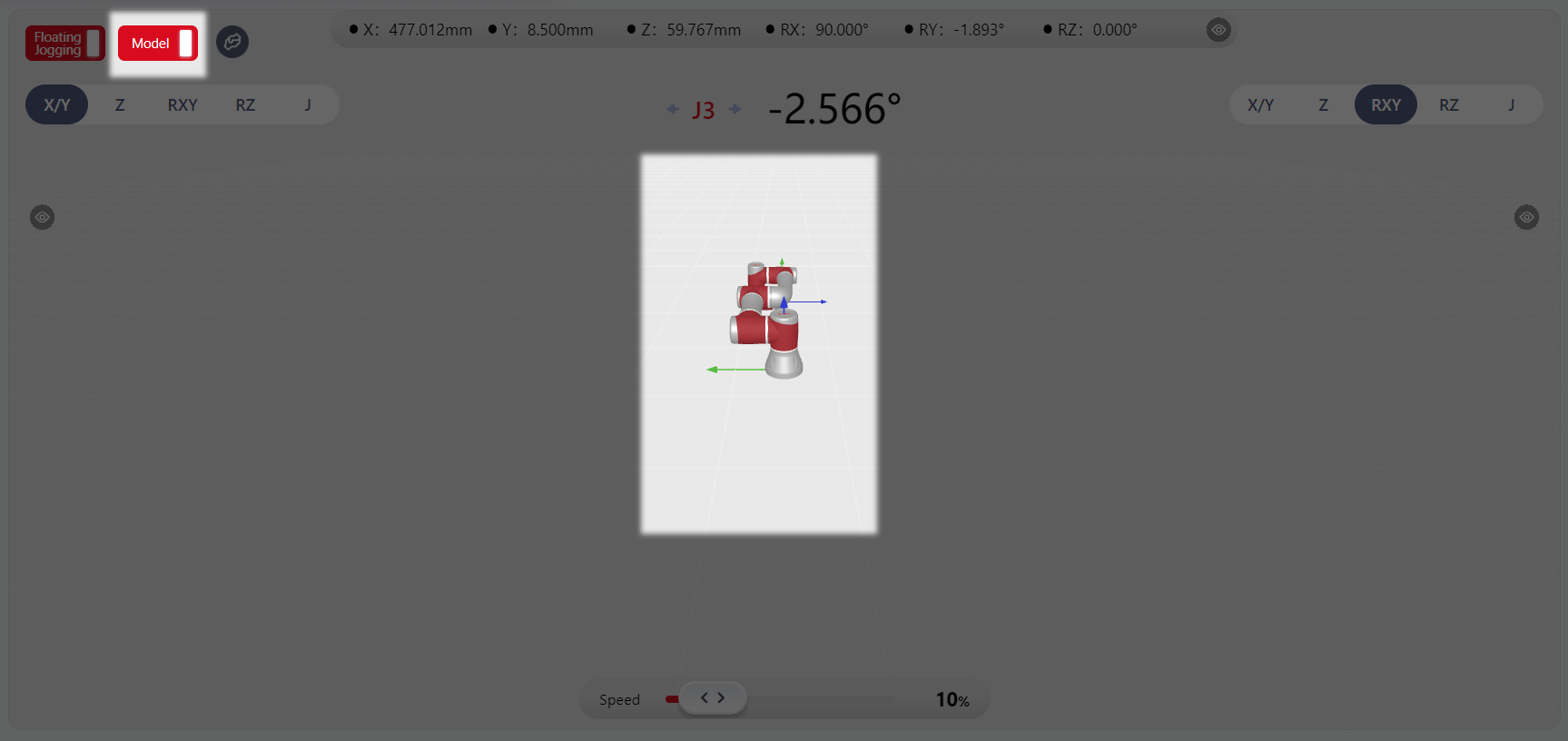Click Model at the top left to show the 3D robot model, which is consistent with the real/virtual robot.
