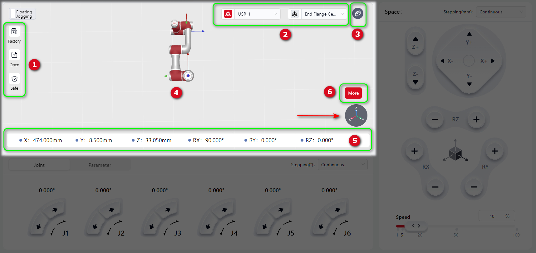 At 2, click the drop-down menu to switch the coordinate system used for Cartesian JOG motion between World (User) coordinate system and Tool coordinate system (flange center).