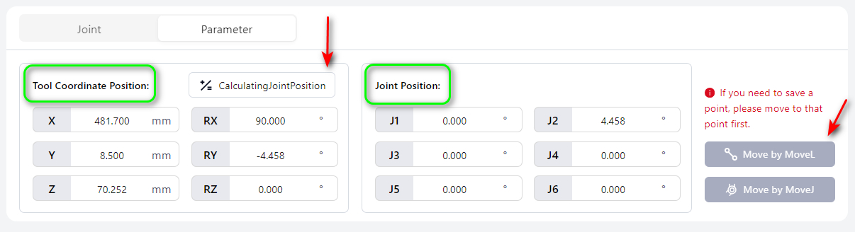 Method 1: Enter axis values at Tool Coordinate Position, click Calculating Joint Position, then hold Move by MoveL or Move by MoveJ. The robot moves to the specified point and stops automatically.