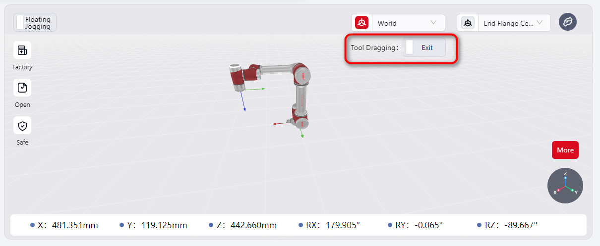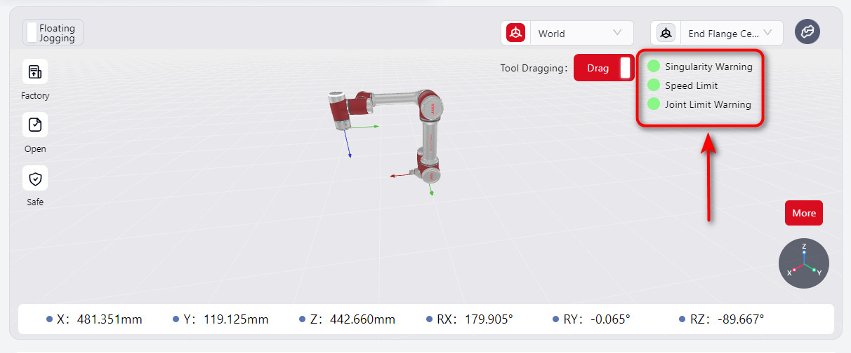 Avoid enabling Tool Dragging in postures that are very close to singularities or joint limits, as these postures may exceed the allowable range for Tool Dragging. Due to safety restrictions, the robot cannot be dragged even if Tool Dragging is enabled.