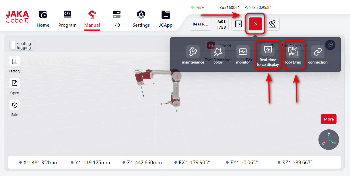 tool dragging, ensure that the robot's load has been set correctly. - Before configuring direction, feel, rebound, and other parameters, ensure that tool dragging mode is turned off.