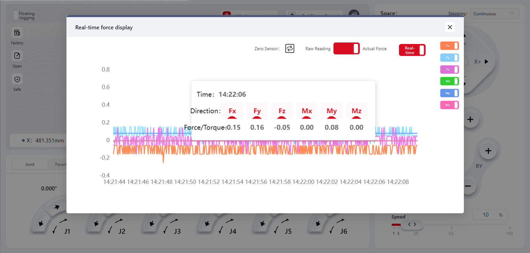 When the Real-time toggle is on, the force curve will continuously refresh. When off, the curve will stop refreshing, and it will display the last recorded force curve. Click on any point on the curve to see the recorded force data at that moment.