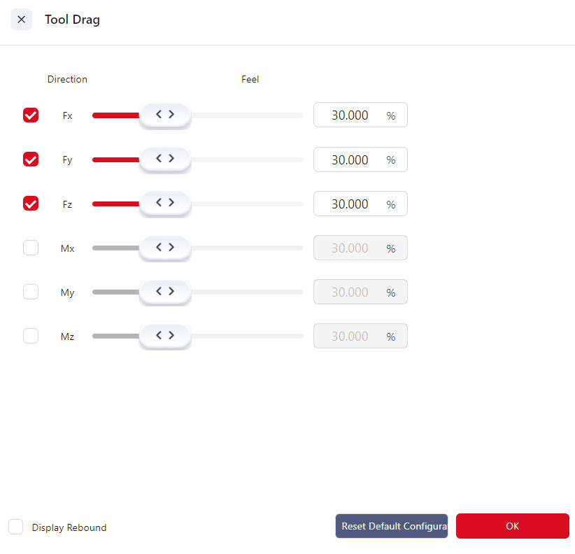 The feel setting determines the force required to move the robot in Tool Dragging mode. The harder the feel setting, the greater the force needed to drag the robot. Fx, Fy, and Fz correspond to displacements along the X, Y, and Z axes, while Mx, My, and Mz correspond to rotations around these axes. When the checkbox for a specific direction is selected, the feel slider for that direction turns red. Adjust the slider to modify the feel stiffness, and click "Confirm" to enable dragging the robot in that direction.